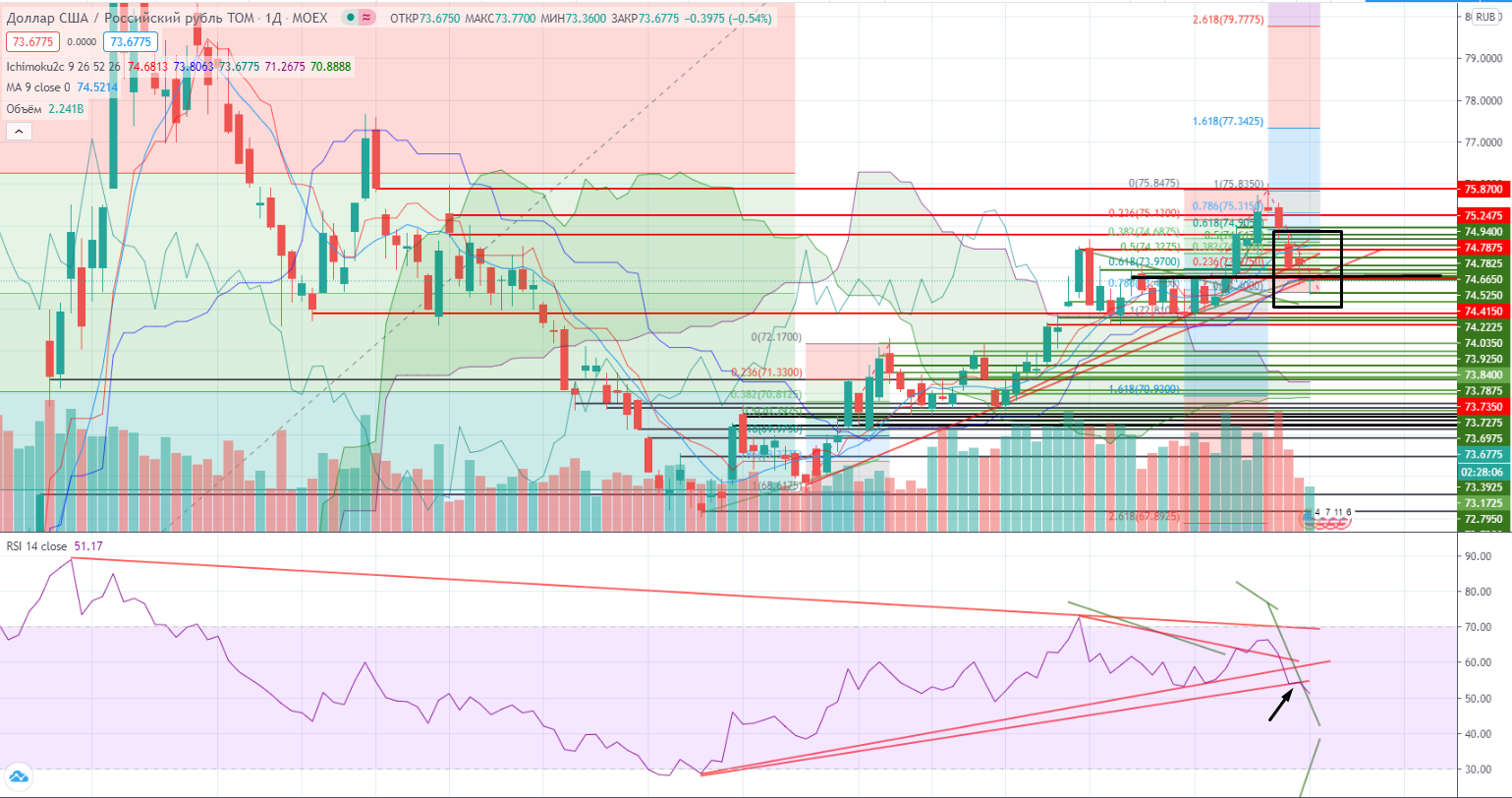 При проходе долларом 73,75+ можно покупать в рассчете на закрытие гэпа 74-74,05, RSI уже под трендом, стоп 73,7- по закрытию часа.