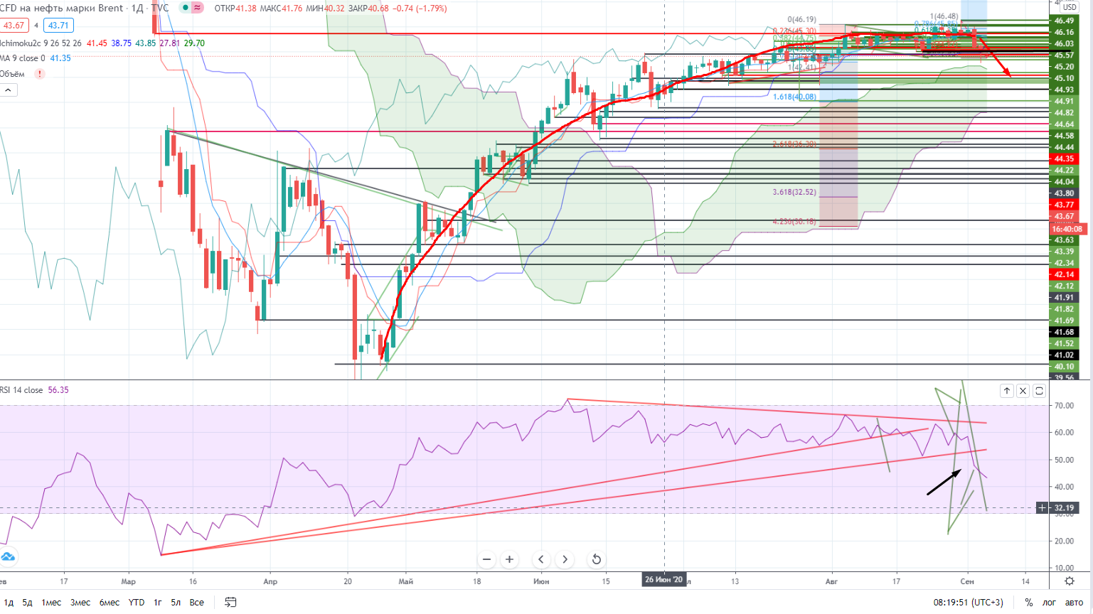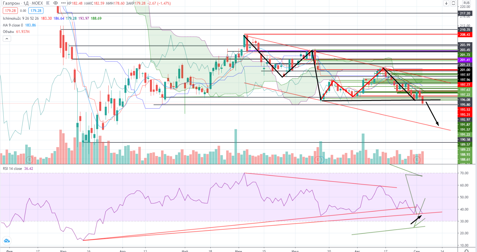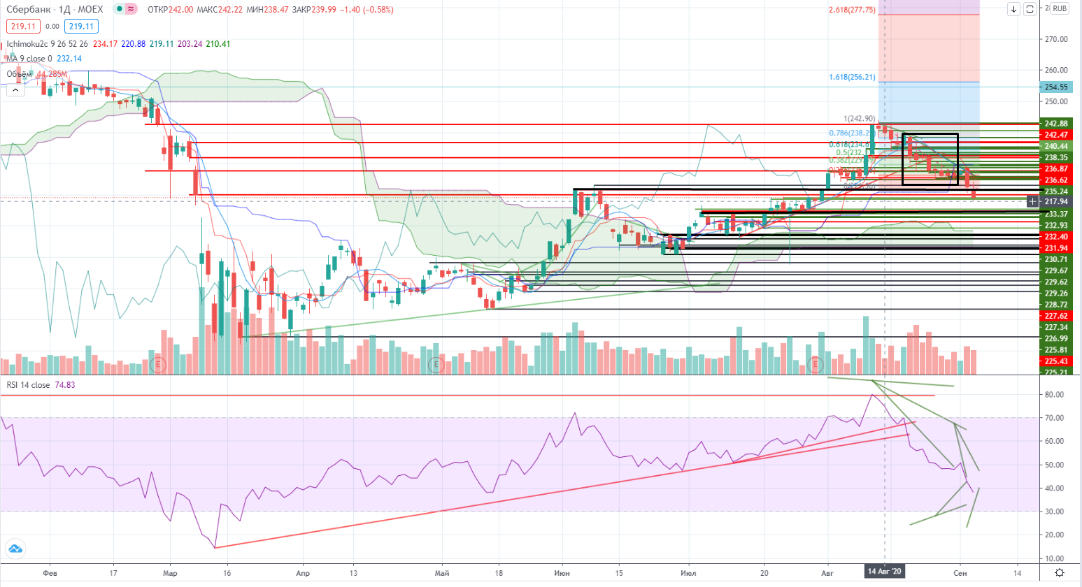 Так в Сбербанке к примеру пройден важный уровень поддержки 221,5, и следующий уровень только на 214,6, RSI при этом не противоречит происходящему. После девяти черных свечек вроде появился легкий намек на надежду на отскок, но Навальный с его отравлением (было или нет не особо важно, главное что подумают на Западе) получил продолжение падения. Так что все выглядит логично. И дивиденды (рекомендованные (!) только при до сих пор не ясной датой отсечки) не спасут ситуацию. А если все таки объявят официально, то это может иметь локальное воздействие. Короче говоря вчера явно не допадали, не было паники, а без этого сложно расти при такой внешней ситуации.