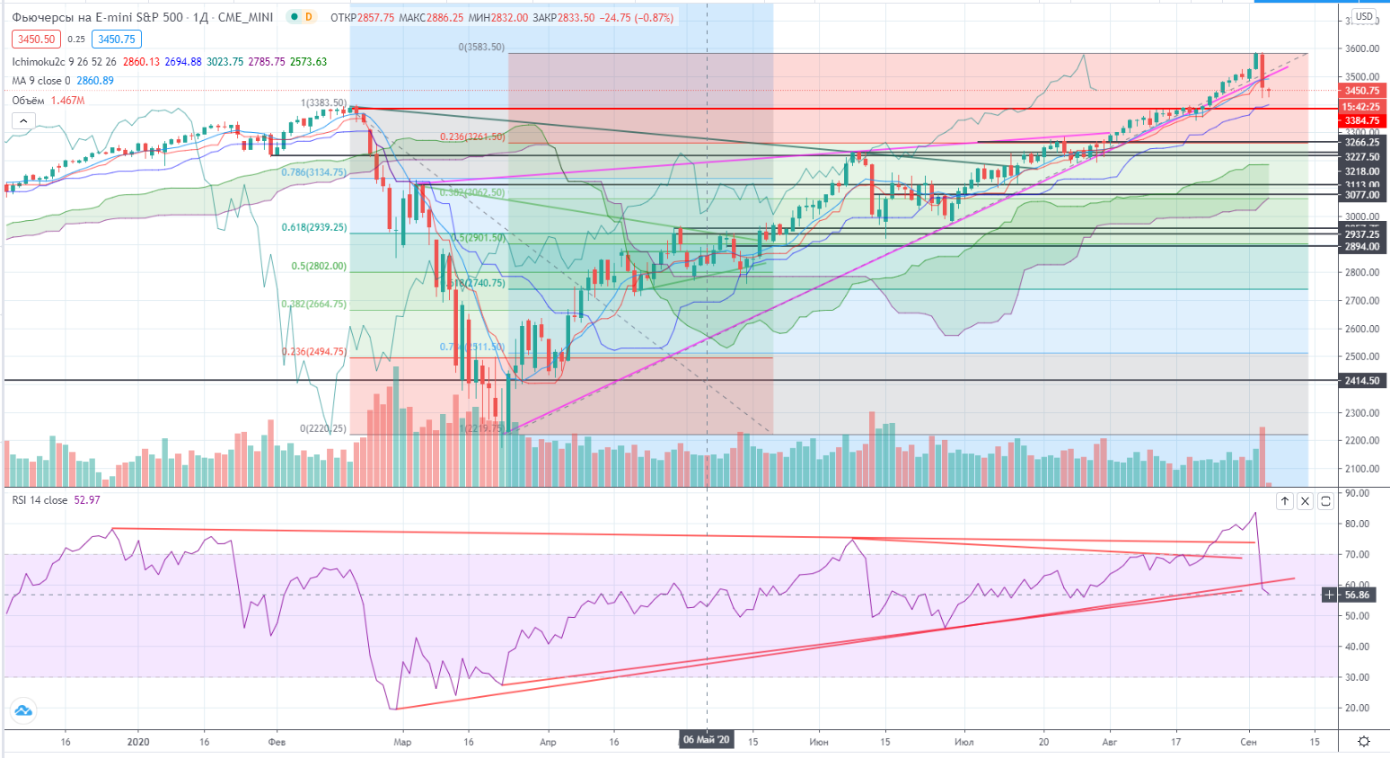 Вчера в Америке началась долгожданная коррекция. Nasdaq и фьючерс S&P потеряли вчера 5+% и 3+% соответственно. Факт остается фактом, мощный коррекционный импульс пошел. И это явно негатив нашему и без того слабому рынку.