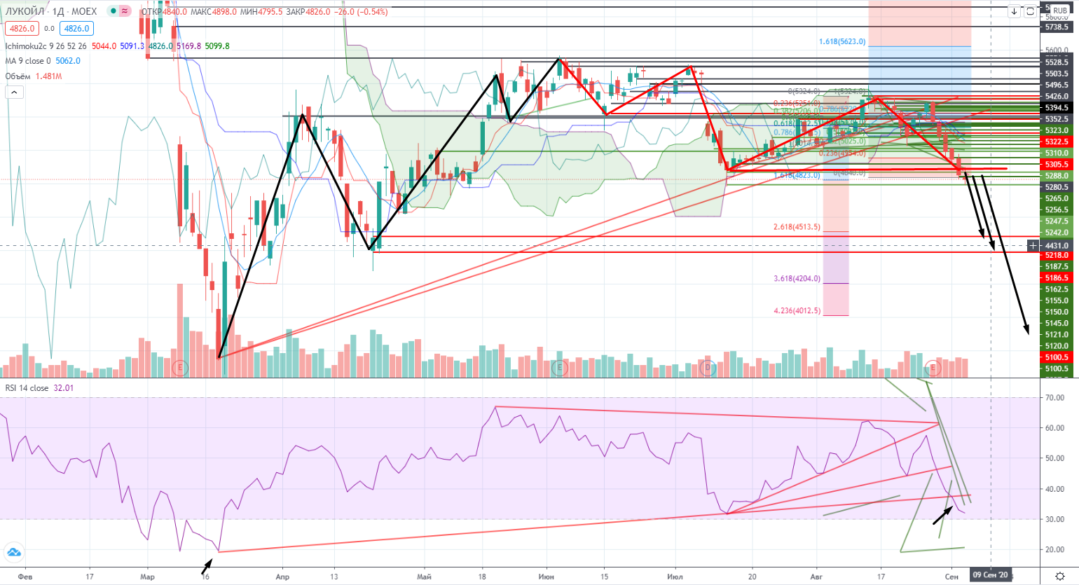В Лукойле аналогичная картина. Пройден реперный дневной уровень 4884, после чего появился шанс продолжить падение. Но в отличии от Газпрома у Лукойла может быть временная остановка на 4402-4475, но может после отработки этих уровней пойти и дальше к своему лоу 3754. Но последнее все таки мало вероятно, а вот к 4402-4475 выглядит вполне реально.