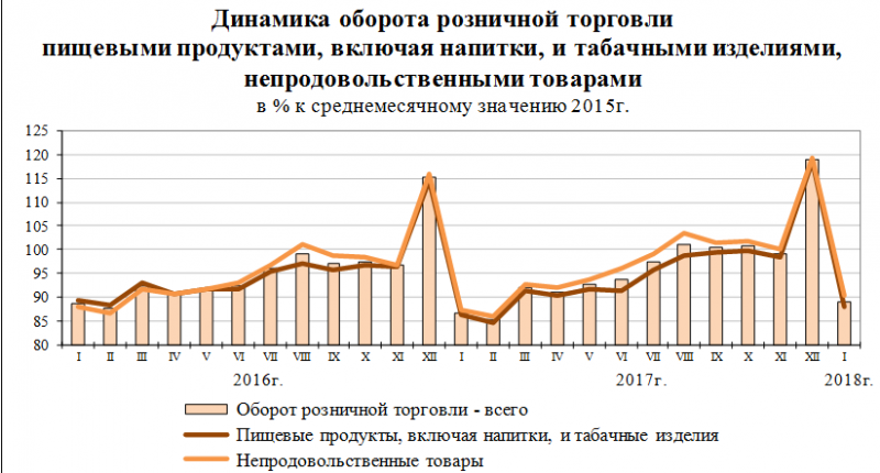 В январе 2018 года оборот торговых организаций составил 2,3 трлн рублей, что на 2,8% выше, чем в первом месяце 2017 года.