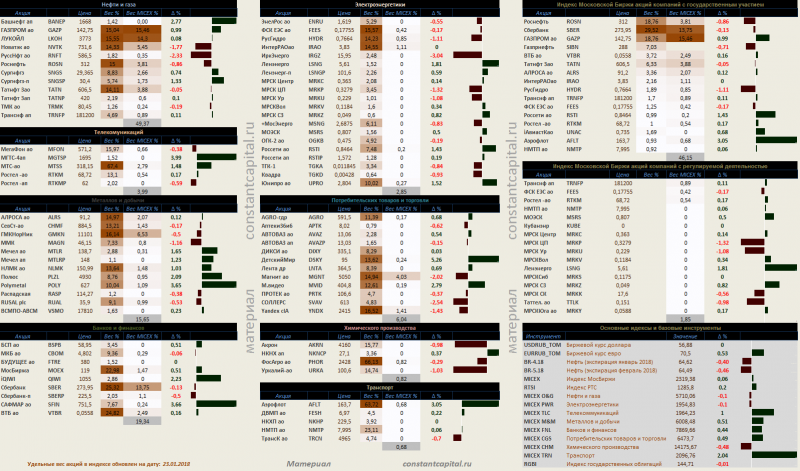 Динамика акций за текущий день, в структуре отраслевых индексов, и индексов государственного сектора.