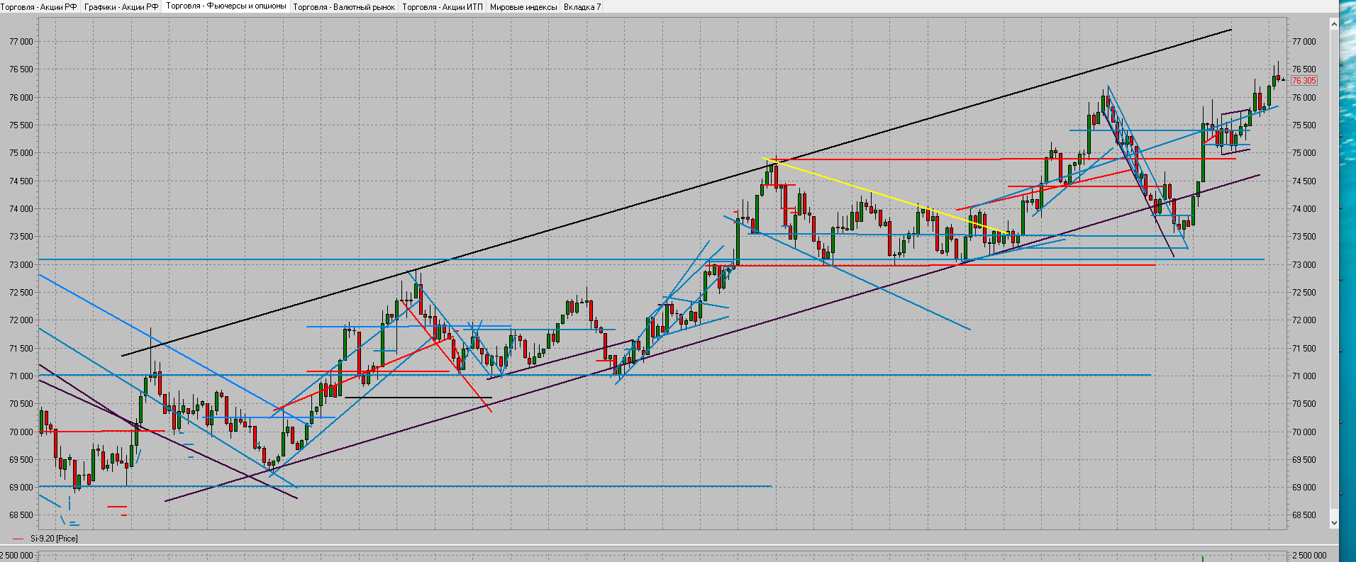 Ага, так что повторно сподвигло возвращаться к этому движению?. Как заметили я делаю обзоры с опережением цены с вероятностью будущей стоимости в течении недельного цикла. В последнее время многие заговорили о цене 80 и даже 100, да ребята хорошо, уже бежим и покупаем. Нет, на самом деле этот возможно и вероятно но не сейчас. Недельный график формирует треугольник вот на этом значении 75000 -75500 можно покупать кто не успел. Верхнее значение это 77000 и 77500. Значение пробития 76600 скорее всего будет сигнализировать на значения 77 и 7750 перечеркнутый моего мнения. В общем выкладываю 2 графика смотрим, анализируем. Подсказка для 2 графика мы находимся в середине канала а это у нас уже было месяц назад смотрим на график.