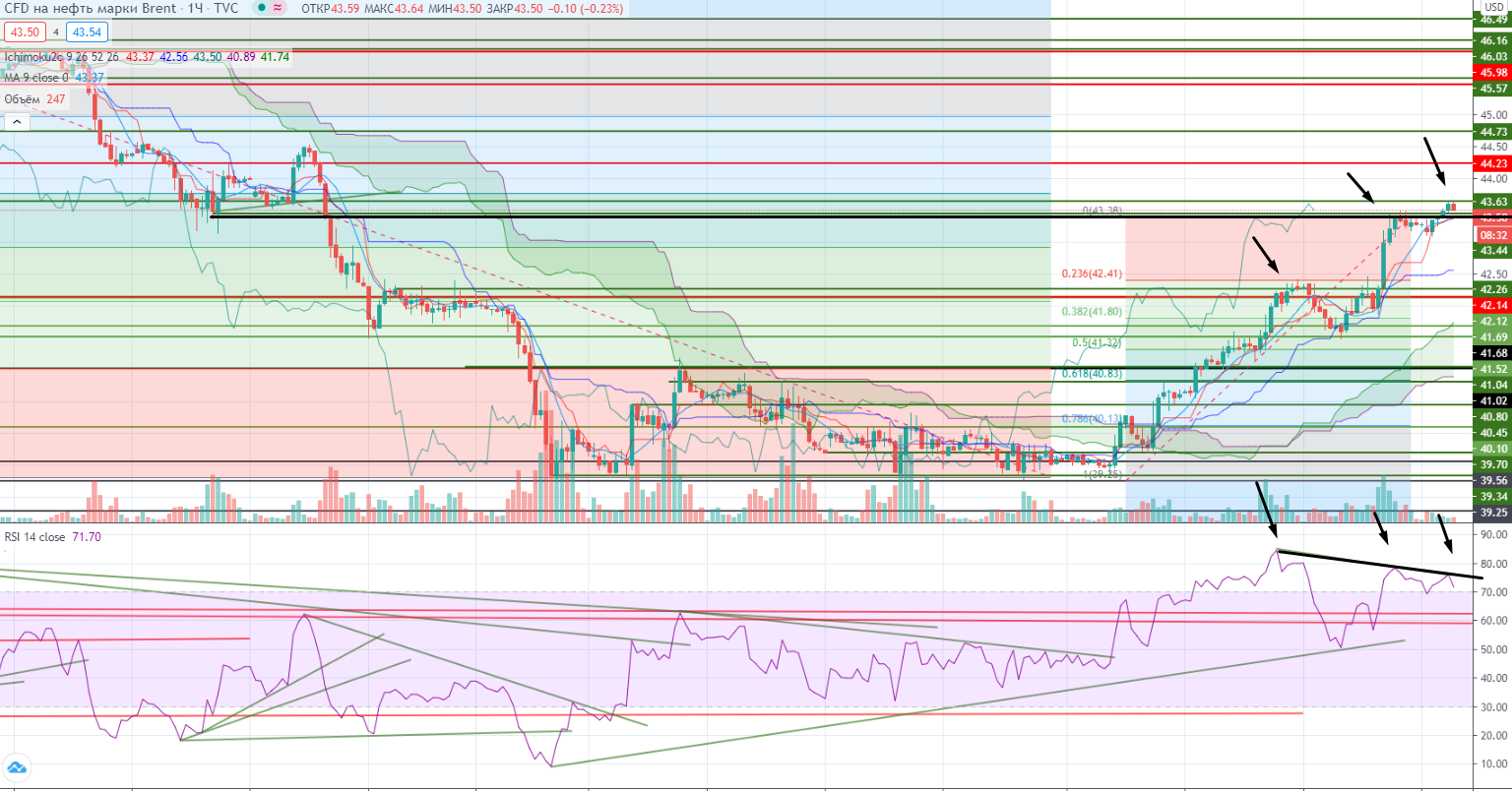 Нефть росла как на дрожжах, и вроде как все хорошо. Возможно рост продолжится вплоть до $44,26 (нижняя граница дневного канала).