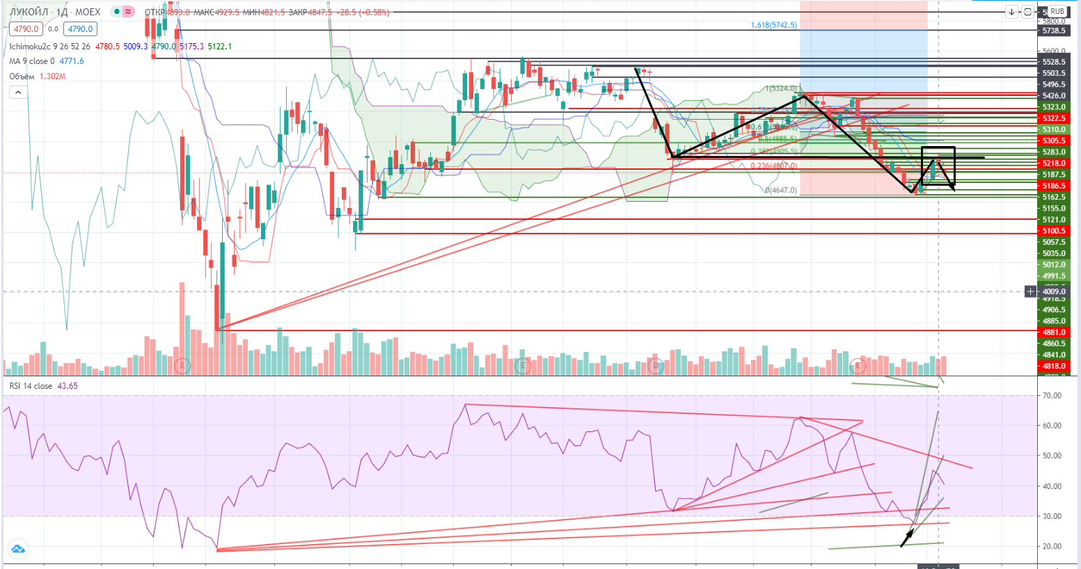 Уровни для продажи на часах-4790-4800 (стоп 4810+), 4823 (стоп 4830+) и главный реперный уровень 4886. Кстати в Лукойле может формироваться как раз правое плечо ГиП, RSI подтянулся к 50. Я продал на «кривой» ½ Лукойла по 4790, исполнив заявку, которую я ставил еще в первой половине дня. Встал в так называемый спрэд с Газпромом. В идеале конечно хотел бы со Сбербанком, но как получилось, так получилось.