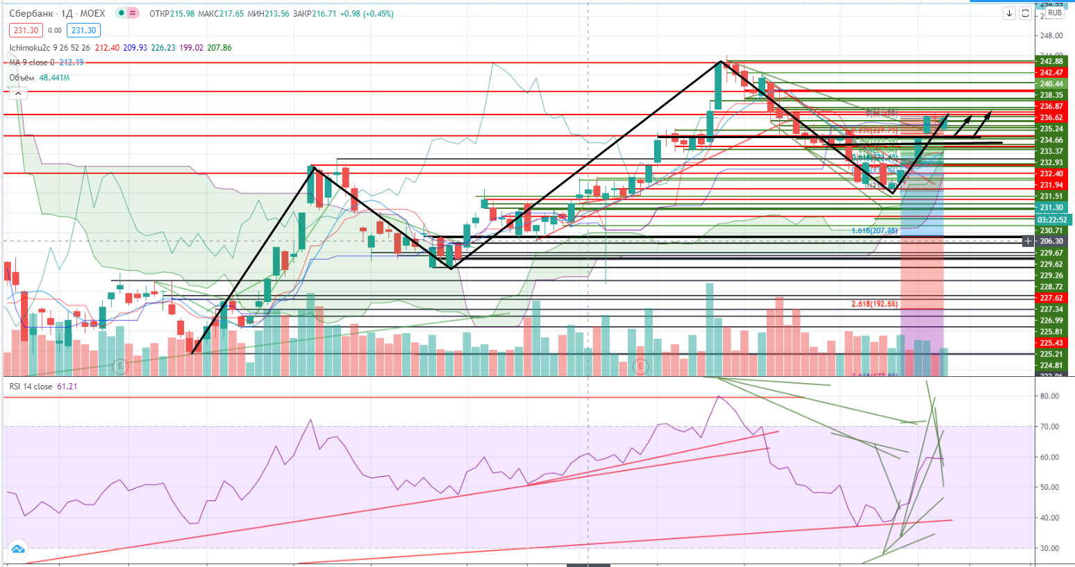 Но на часах возникают серьезные разногласия с RSI. Во первых не взят пока уровень сопротивления 231,62. Во вторых даже после взятия его возникнет ситуация, что возможна 5-я волна роста, потенциальная дивергенция будет при этом присутствовать еще долгое время. Но покупают все равно. Поэтому я рискну, при пробое 231,7+ буду покупать, но морально готов все же на то, что пробой может быть ложным. Стоп 231,4-. Если это произойдет, то я временно не торгую… Буду ждать хорошей коррекции и покупать внизу. По крайней мере до дивидендной отсечки. Остается определить уровень поддежки, а его определить можно только участвуя в сделках, что очень небезопасно.