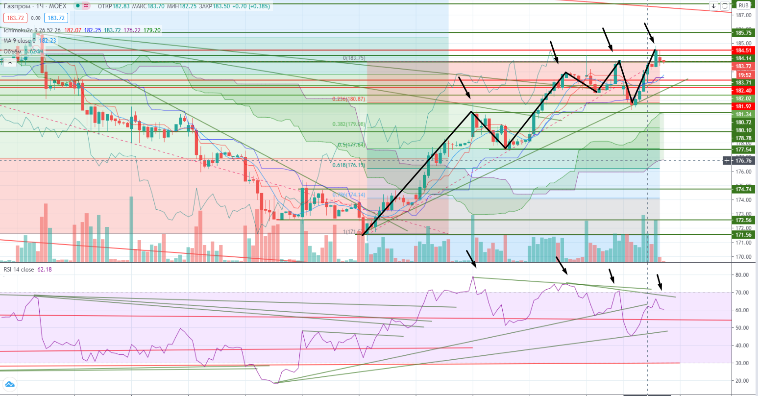 Газпром закрыл основную сессию выше реперного уровня 182,59, открыв себе дорогу дальше наверх. Но рост может быть ограничен трендом (187,5+-) и RSI, который находится почти под трендом.