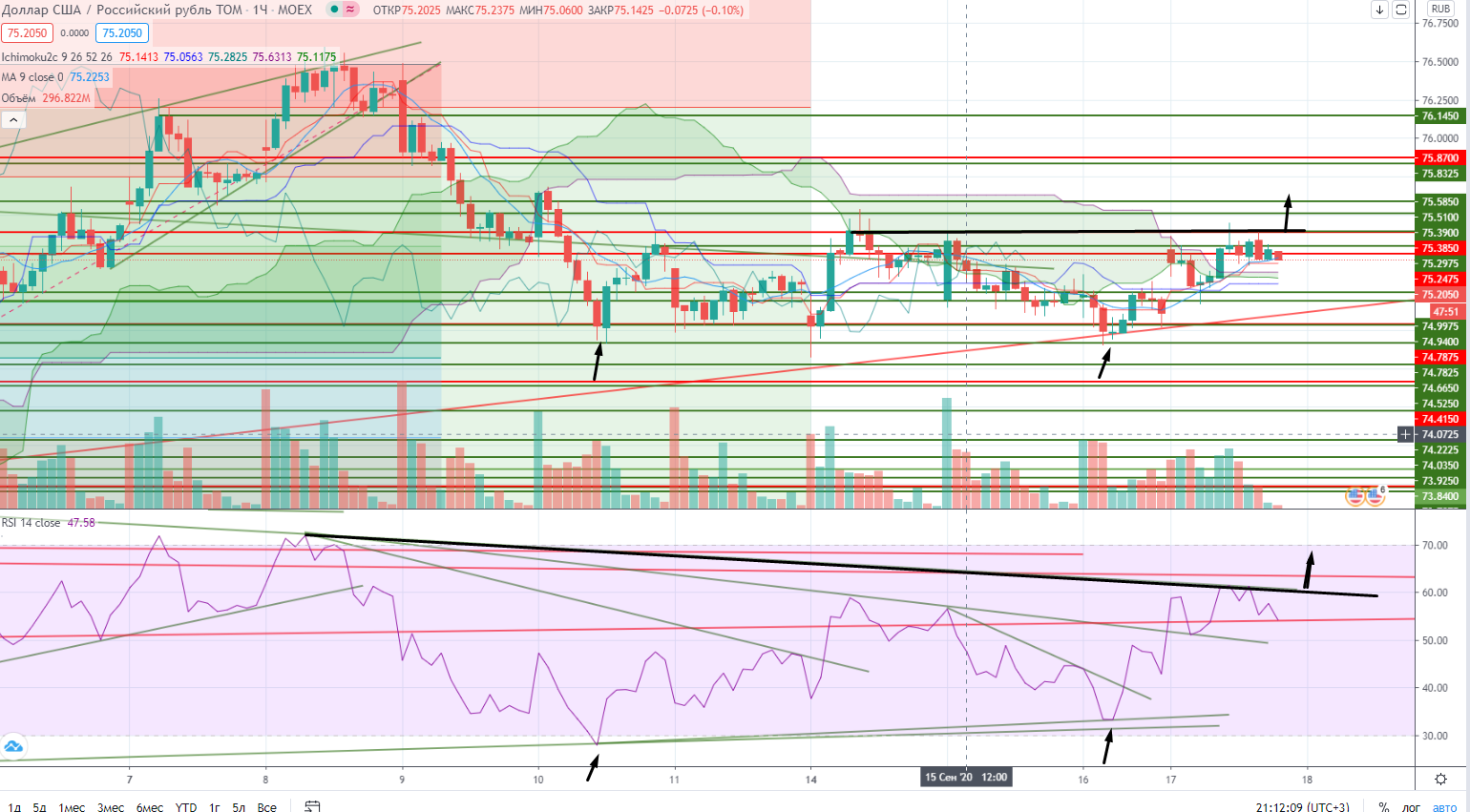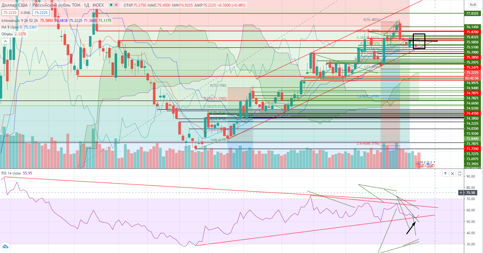 Доллар при закреплении выше 75,4+ можно покупать (лок.хай+RSI будет под трендом), а с учетом предыдущей дивергенции внизу, этот пробой может означать выход из канала 74,74-75,4, и мишенью будет служить 76,06, стоп 75,3-. Расклад очень хорош.