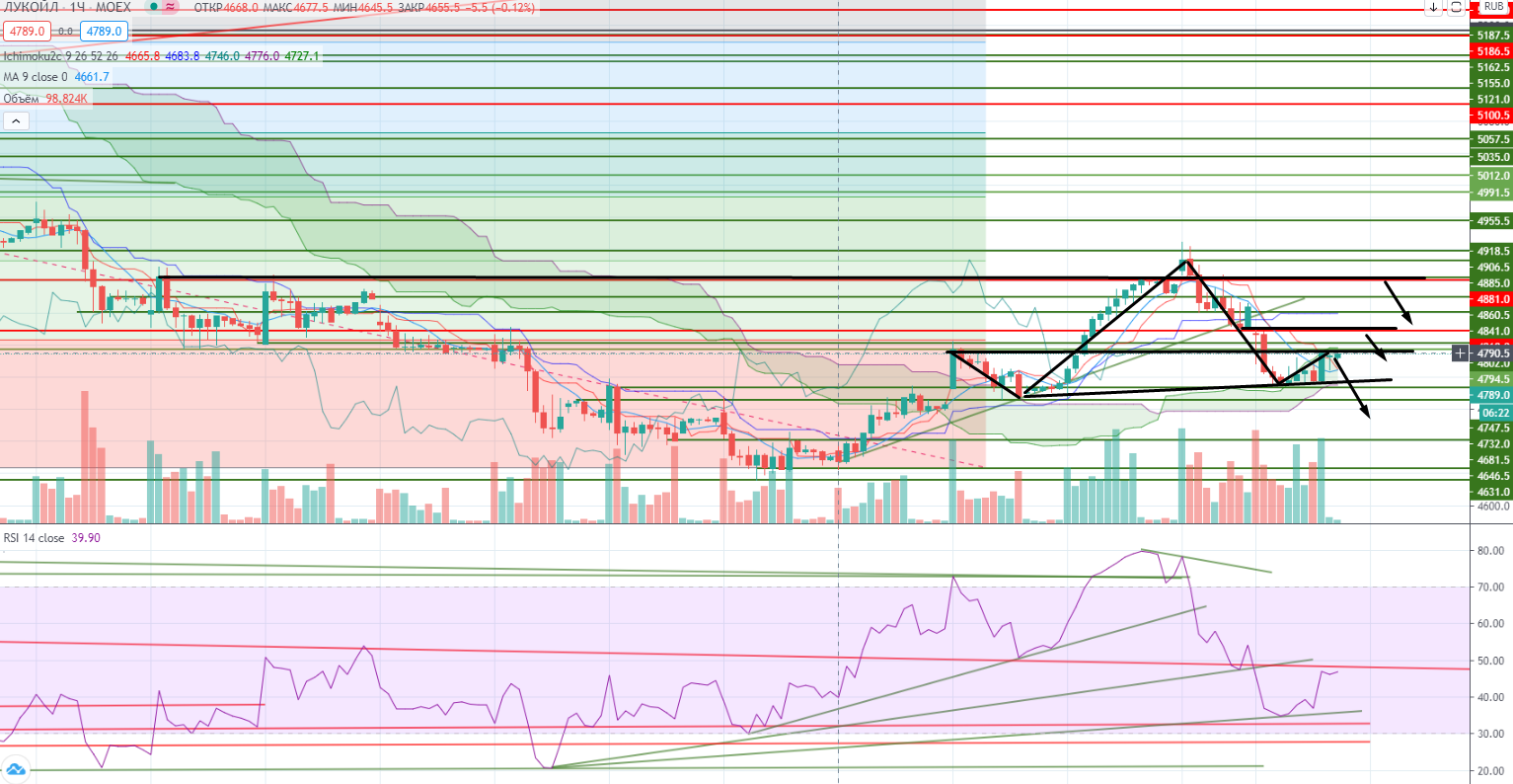 Наиболее логичная бумага оказалась Лукойл. Я снова стал медведем в нем, и до реперного ДНЕВНОГО уровня 4886 даже думать о лонге не хочу. Даже на отскок, я лучше буду продавать и откупать в минус, затем снова буду это делать на уровнях повыше, но пока уровень 4886 не пройдут вверх по закрытию дня(!) я о лонге в Лукойле даже думать не хочу!!! Причем я хочу удержать шорт как минимум до предыдущего лоу 4661 (на дне не было дивергенции).