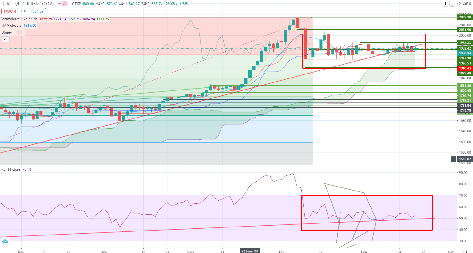 Золото пока торгуется в боковом канале, и пока очевидных движений я там не вижу, тем более что RSI стоит в районе 50. Но… Приближается день выборов в США, и очень возможна «развязывание маленькой войнушки», так по крайней мере было очень часто. И я не удивлюсь совсем если это «войнушка» будет локально развязана. А когда развязывается война, то золото и нефть может выстрелить вверх, так что даже из этой пилы приоритетней все-таки выстрел вверх.