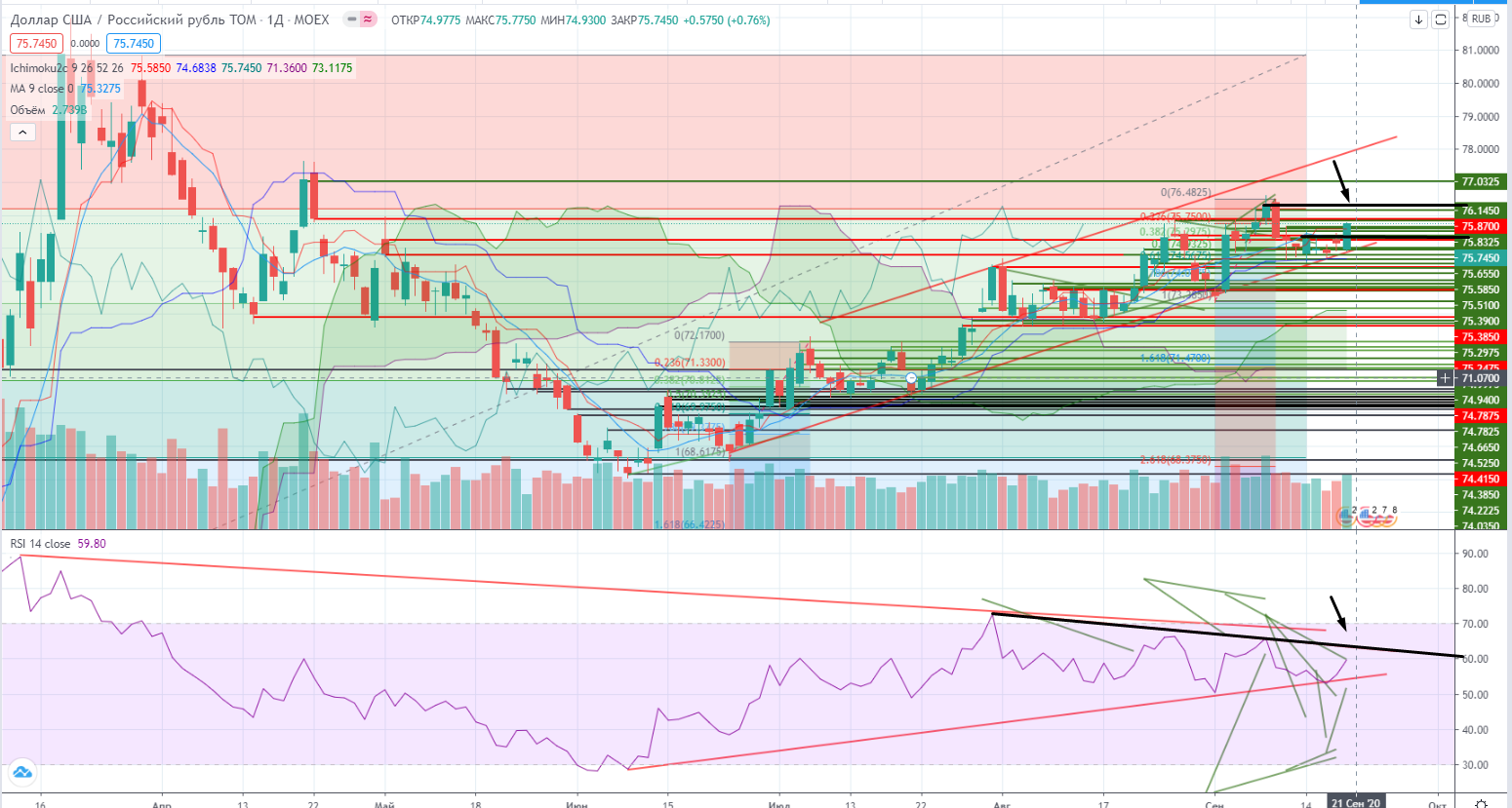 Зато в долларе все таки локально сбылся мой прогноз (https://www.finam.ru/analysis/marketnews/stoit-pristalno-smotret-za-povedeniem-dollara-20200918-09550/), и в пятницу он вышел вверх. Он может продолжить расти до как минимум 76,28, на RSI там примерно тоже ждет сопротивление в виде дивергентного тренда.