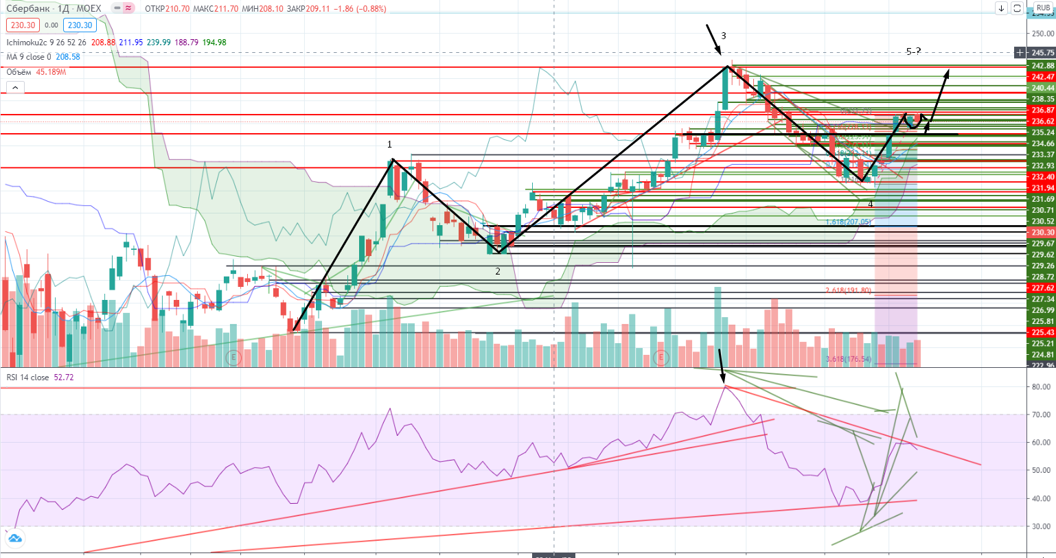 В Сбербанке я не исключаю, что к отсечке он подойдет как минимум к повтору хая (242,4), тем более что не было дивергенции на хаю, поэтому приоритетней торговать от покупки.