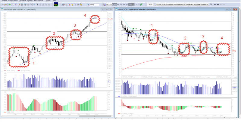 Построил 2 недельных графика один индекс RGBI, а второй доллар /рубль. Обведены совпадения по датам. похоже намечается 4-й выход.