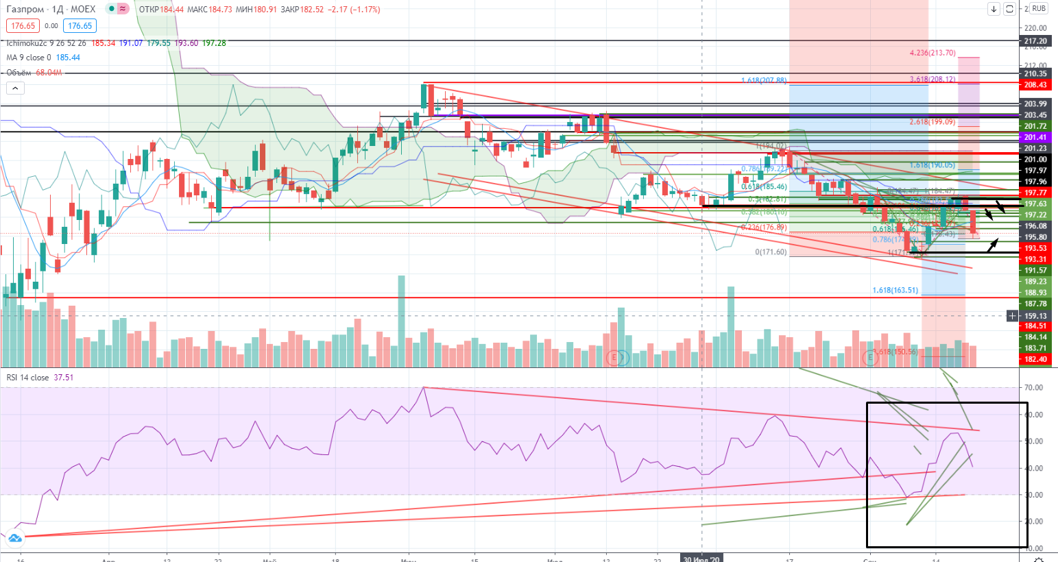 В Газпроме пока все просто относительно. От покупки можно торговать на локальном лоу 173±, от продажи -от реперного уровня 182,60 до новых ложных локальных максимумов 183,8-183,9. В середине диапазона не рекомендую торговать, т.к. любое движение примерно равносильно и находимся сейчас далеко от стопов.