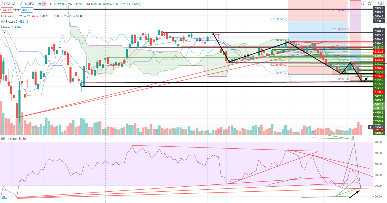 В Лукойле достигли возможно локальной зоны поддержки 4402-4475, RSI тоже пришел на тренд. Как я и писал раньше (https://www.finam.ru/analysis/marketnews/blizhe-k-vyboram-v-ssha-ne-isklyuchen-povtor-istoricheskogo-xaya-20200921-09550/), в Лукойле предпочтительна торговля от шорта. Мишень от фигуры «Голова и плечи» сработала, но не остановила падение. На отскок конечно можно покупать, но стоит помнить при этом, что у Лукойла появился новый реперный уровень 4661 в довесок к основному 4884. Это нужно держать в голове постоянно.