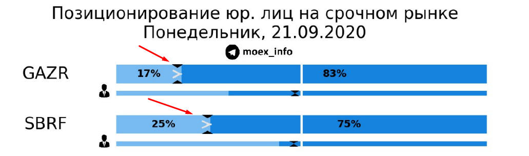 Интересно получилось. Стоило в пятницу и юридическим, и физическим лицам сокращать лонги в Сбербанке и Газпроме, как тут же получили падение. Это так, к слову. (https://www.finam.ru/analysis/marketnews/blizhe-k-vyboram-v-ssha-ne-isklyuchen-povtor-istoricheskogo-xaya-20200921-09550/). И вчера динамика открытых позиций косвенно подтвердила мое предположение, что юридические лица «более определяющие», чем физические…