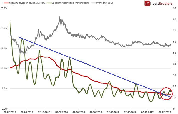Помимо тестирования локальных минимумов произошло еще одно интересное событие – возросла волатильность рубля, которая на протяжении трех лет подряд падала. Таким образом, был сломлен нисходящий тренд.