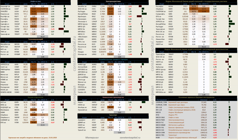 Динамика акций за текущий день, в структуре отраслевых индексов, и индексов государственного сектора.