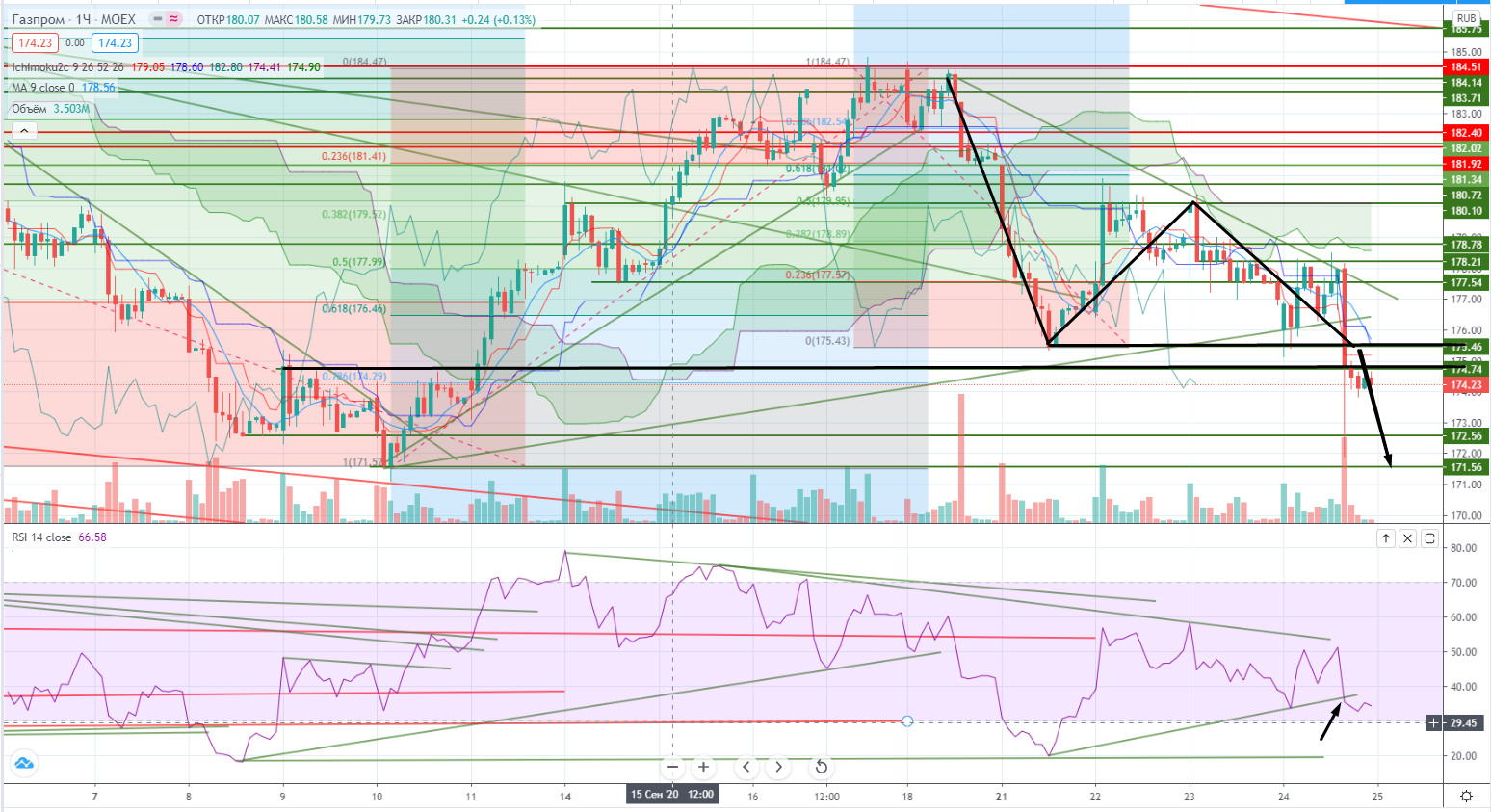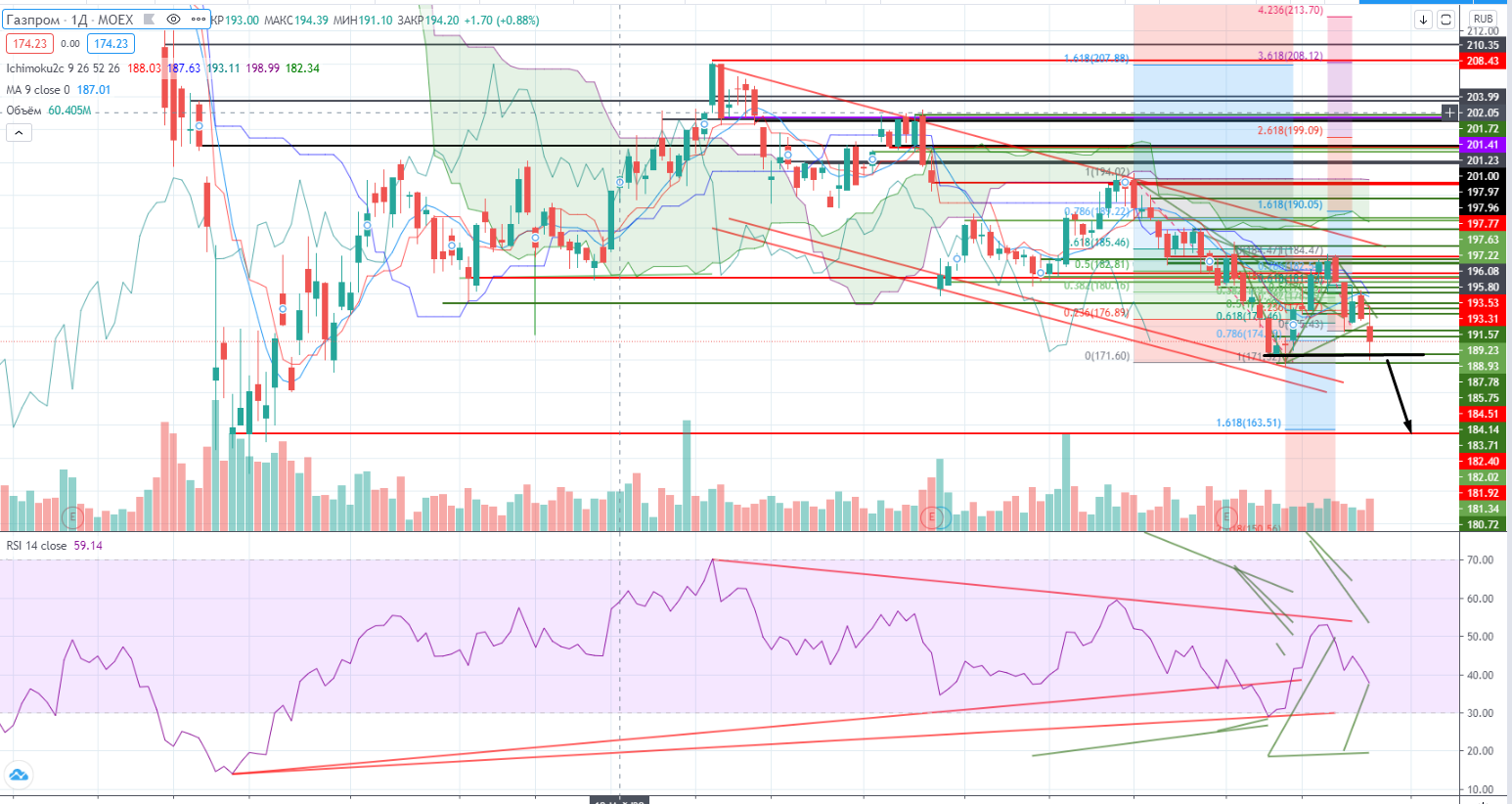Вечером вышли новости, среди которых была эта: «МИНЭНЕРГО РФ ОБСУДИТ С МИНФИНОМ РЯД ОПЦИЙ ДЛЯ ФИНАНСИРОВАНИЯ ГАЗИФИКАЦИИ, ВКЛЮЧАЯ НАЛОГОВЫЕ ЛЬГОТЫ ГАЗПРОМУ И СНИЖЕНИЕ ДИВИДЕНДОВ». Лишний раз доказывает, что от покупки в данной ситуации и на этих ценах торговать очень опасно. После этой новости Газпром рухнул почти до своего минимума 171,5, разом встав в продажу. И его можно продавать со стопом 175,7+. Покупать же в такой неопределенной ситуации я не хочу и не буду. Возможно я буду себе кусать локти, но потом, но в случае снижения дивидендов в будущем я не исключаю похода даже к 163, а может даже и ниже.
