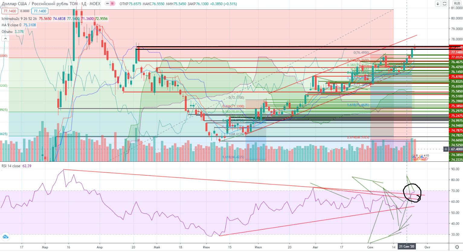 Кстати доллар «застрял» в диапазоне 77,08-77,29 (https://www.finam.ru/analysis/marketnews/situaciya-s-yandeksom-ochen-neponyatnaya-v-nego-luchshe-ne-vxodit-20200924-09500/) , а RSI накернил свой тренд. Так что я не исключаю роста до мишени 77,88±