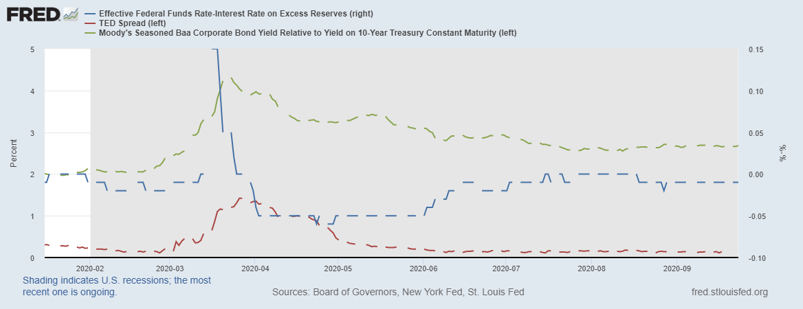Красная линия – это ТЕД-спред, отображающий спрос на ликвидность на международном рынке в Лондоне (Libor). Мы уже видели, что дневные РЕПО для нерезидентов на минимальных уровнях с 2016 года, т.е. дефицита ликвидности за пределами США нет.