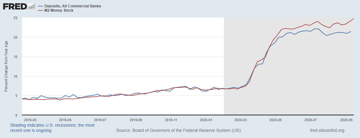 Баланс показателей абсорбции больше не оказывает влияние на денежную массу (показатель М2), тем не менее, на прошлой неделе М2 вырос на 124 млрд долларов, поставив новый рекорд. Способствует этому росту депозиты, т.е. деньги оседают на счетах и не востребованы в экономике, срочно нужен «доктор-спрос»