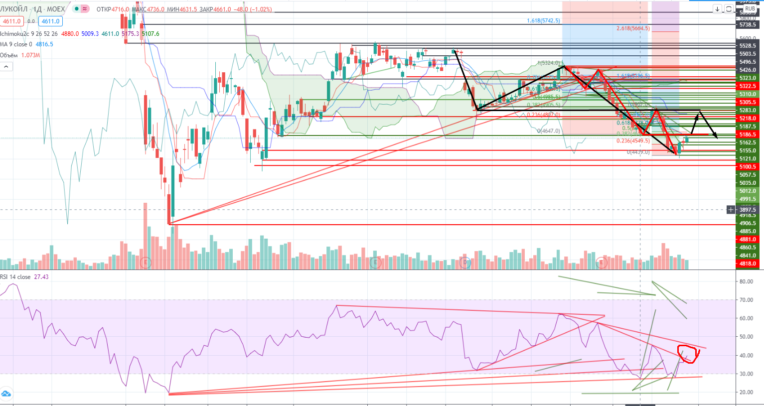 Лукойл в свою очередь закрылся под реперным уровнем 4661, при проходе его скорее всего он дойдет до своего основного реперного уровня 4884, тем более что на дневных графиках RSI пробивает свой локальный дивергентный тренд. Дело осталось только за ценой.