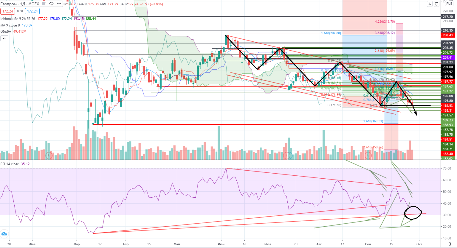 Сбылся мой прогноз по поводу Газпрома (https://www.finam.ru/analysis/marketnews/ne-fakt-chto-dividendy-gazproma-ne-budut-urezany-v-budushem-20200928-09350/) , он по концу дня пробил дневную поддержку 172,95. Видать все же моя теория работает. Но могут возникнуть сложности с продолжением падения, т.к. RSI уже близко подошел к своему дивергентному тренду, так что отскок очень даже возможен, хотя ценовых уровней пока нет на днях.