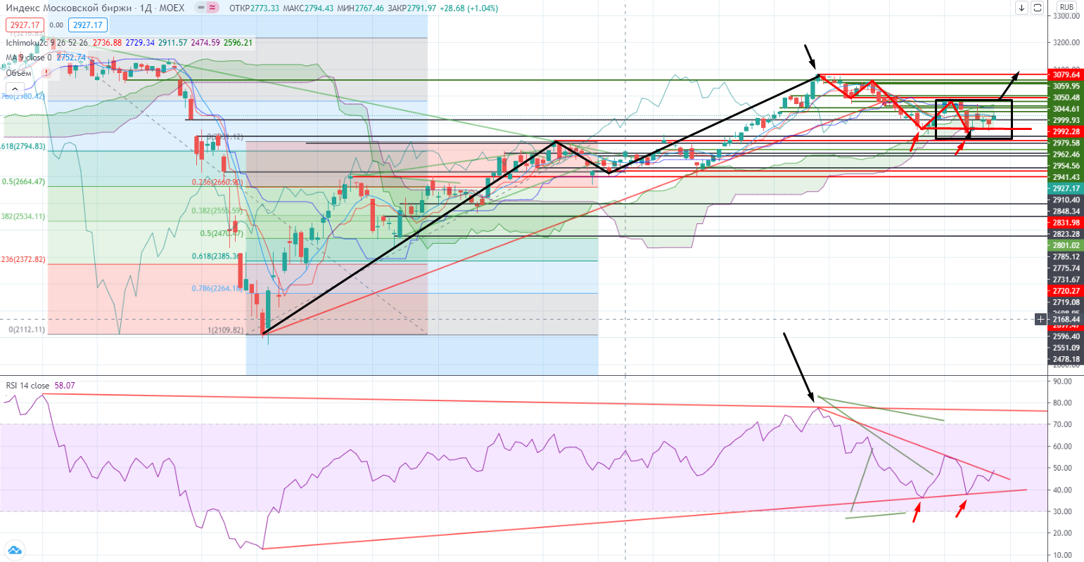 Поэтому более информативен индекс ММВБ. На нем пока четко видна 5-ти волновая коррекция с дивергенцией на окончании, а с учетом того, что не было дивергенции на хаю, вопрос о повторе хая все еще очень возможен. Но стоит помнить, что скоро отсечка в Сберах, и после этого вряд ли этот повтор будет возможен. Так что быкам надо поторапливаться...