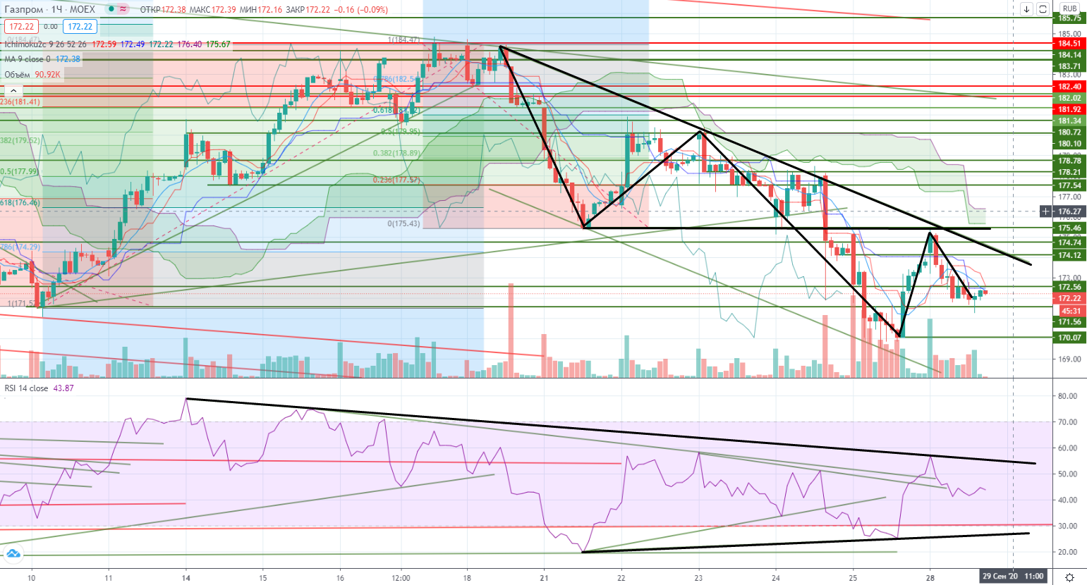 Скорее всего если Газпром сможет подняться до этого уровня я буду снова продавать. Стоп 175,8+, но в лонг при этом я не хочу вставать, потому что почти сразу новый уровень плюс цена находиться под облаком, так что если цена пройдет выше стопа, я конечно закроюсь, но переворачиваться в лонг не буду!!! Вниз же продавать тоже не буду, потому что возникнет противоречия с RSI. Остается одно-ждать роста и пробовать встречать.
