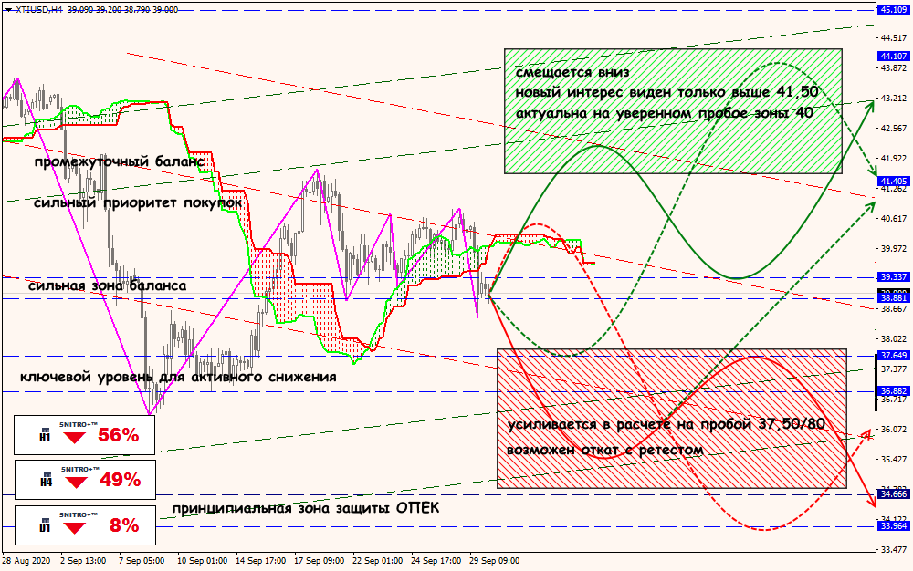 Если на текущей неделе законодатели США согласуют новые меры фискальной поддержки американской экономики или хотя бы приблизятся к компромиссу по этому вопросу, последующие за этим распродажи доллара будут позитивны для нефти. Но пока ситуация с коронавирусом не покажет хотя признаки стабилизации, попытки активного роста на оживлении интереса к риску будут неудачны. Риск более агрессивных продаж с тестированием уровня $40 сохраняется.