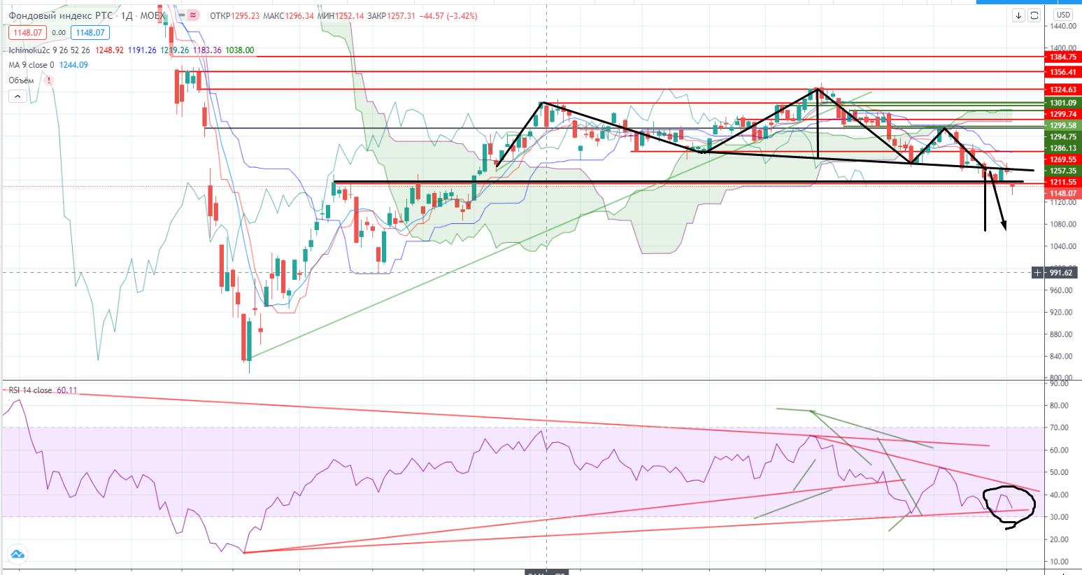 Индекс РТС пробил пока формально горизонтальную поддержку 1155 (формально из за непробития RSI своего дивергентного тренда).Но при этом возможно(!) сформировалась фигура «Голова и Плечи» с ретестом и мишенью в район 1058, так что все пока за шорт, кроме RSI. Но если и RSI пробьют свой тренд, то падение нам обеспечено.