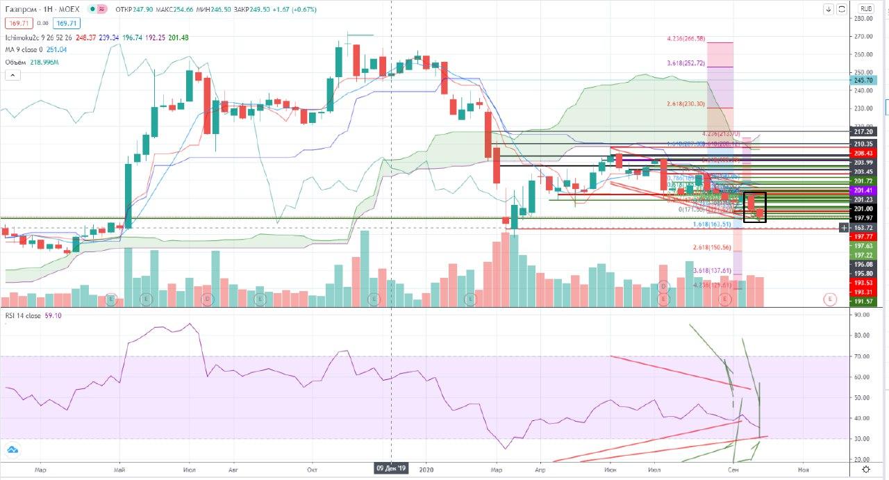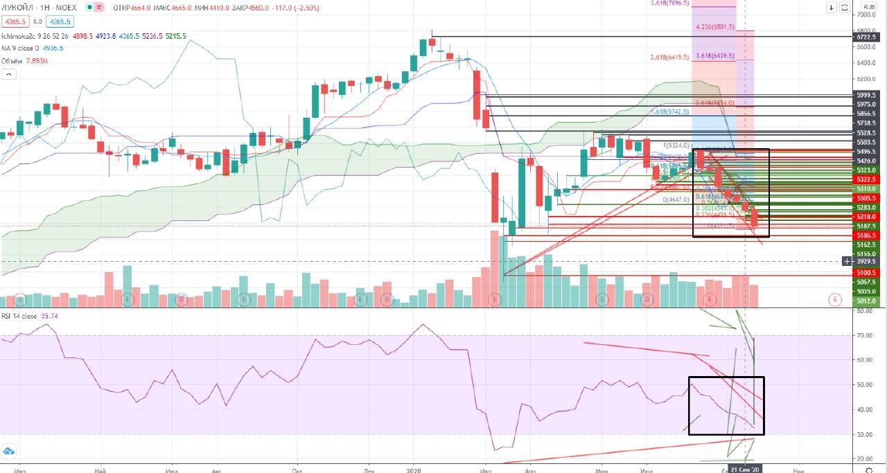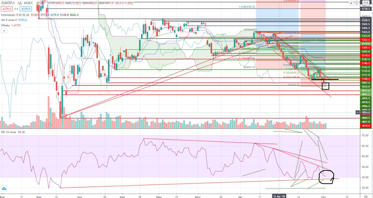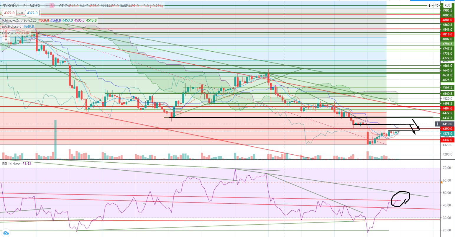 Правда на дневных начало появляться некоторое противоречие продолжению падения в виде последней свечи в виде (доджа). Возможен отскок, но все равно в целом Лукойл выглядит выглядит недопадавшим (RSI имеет еще свободу хода).