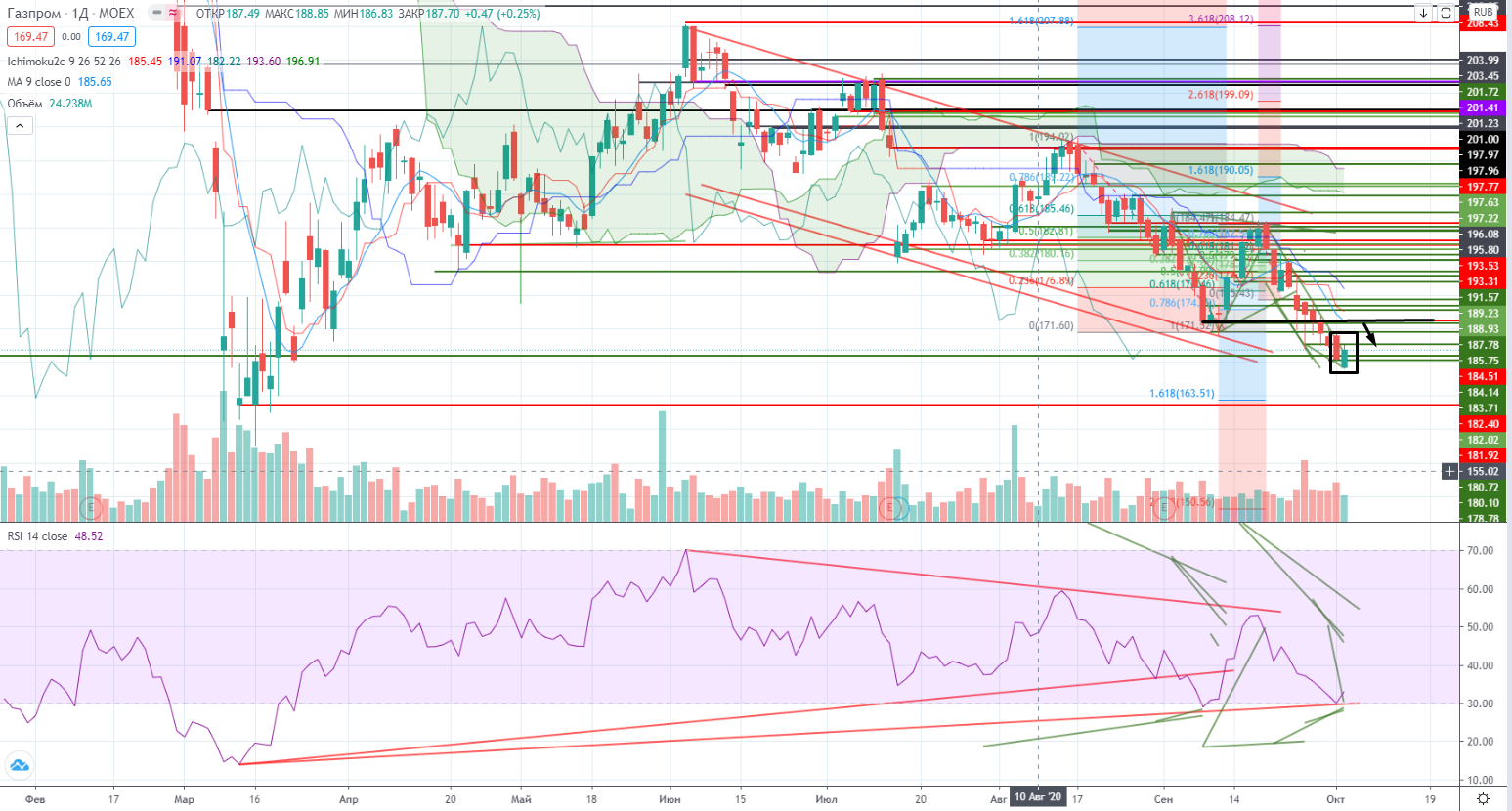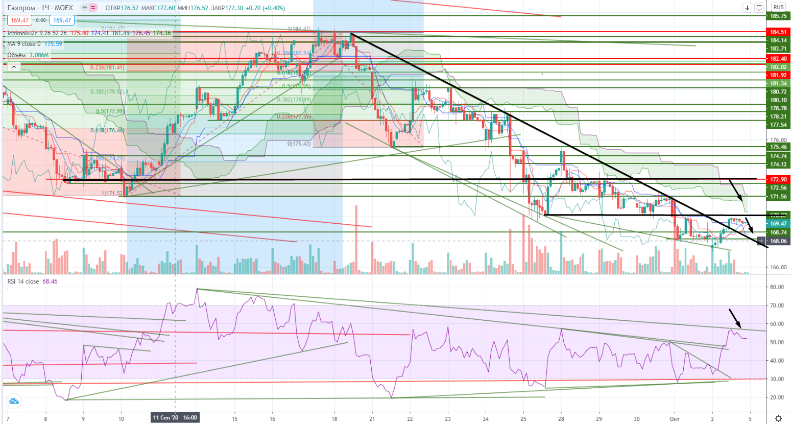 Правда на днях формируется возможно разворотная формация, но нужно подтверждение в виде белой свечи… Но даже при проходе вверх он все равно в глобальном плане стоит в шорте, по крайней мере до реперного уровня 173, так что тоже не стоит размениваться на отскок, а лучше дождаться его и продавать снова.