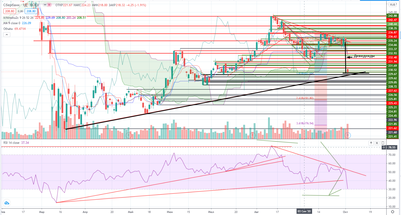 Произошла отсечка в Сбербанке и он ожидаемо упал. Но только на величину дивидендов, в то время как остальной рынок уже падал до этого неделю как минимум. Технически анализировать пока Сбербанк слишком рано, но с учетом его крепости перед отсечкой я совершенно не удивлюсь, если он упадет еще хотя бы до 200 рублей (всего то еще 4%, в то время как Лукойл например упал на 10% и Газпром на 7,8%). Но торговать из этих расчетов крайне опасно, в Сбербанках началась новая жизнь с новыми уровнями, которые нужно сформировать, проторговать и т.д. На это может уйти некоторое время.