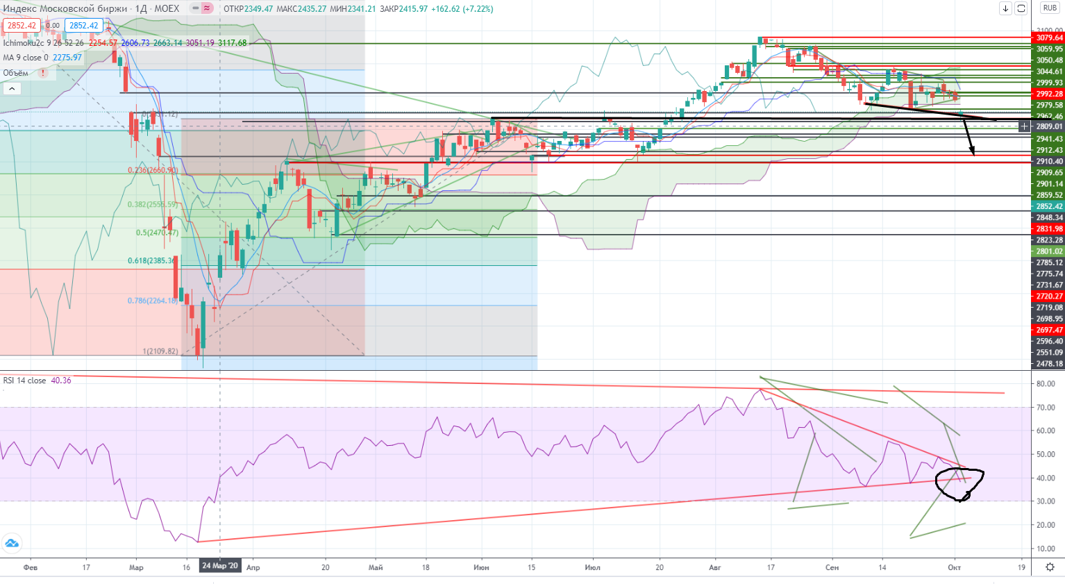 В индексе ММВБ несколько иная картина. RSI уже почти пробил свой дивергентный тренд, а цена пока сопротивляется. Уровень 2831 хоть и пробовали, но он локально устоял. Но при его проходе тоже шорт нам обеспечен.