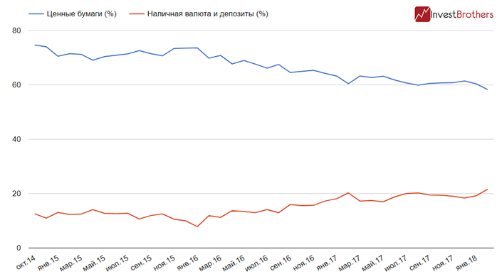 Решение о реализации облигаций могло быть принято из-за повышения процентных ставок, так как на этом фоне долгосрочные бумаги сильнее теряют в цене. Но в связи с тем что одновременно вырос объем “кэша”, то можно предположить, что перекладывания из одной корзины в другую не произошло.