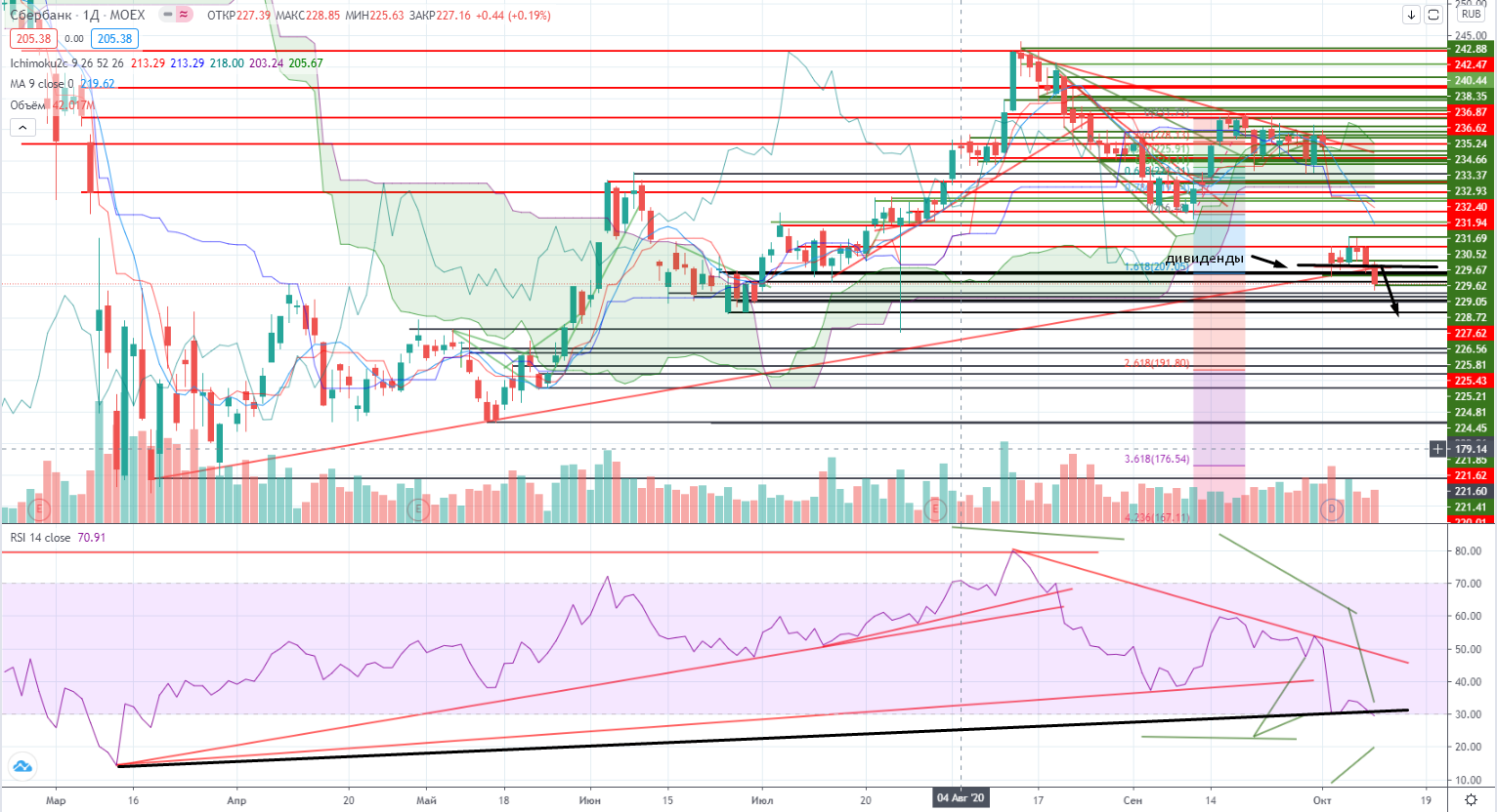 Сбер в пятницу только прошел уровень дивидендов. Но в тот момент, когда рынок уже падал, Сберы стояли на месте. К его отсечке Газпром уже потерял более 10%, и Лукойл порядка 7%. Так что итак запас хода на падение у Сберов был. А сейчас падение пока продолжается, так что от лонга (даже на отскок) в Сберах не рекомендую торговать… Но еще очень мало времени прошло после отсечки, еще четко не прорисовались и соответственно не проторговались уровни, чтобы четко определить стопы, но я не удивлюсь ценам ниже 200- абсолютно!!!