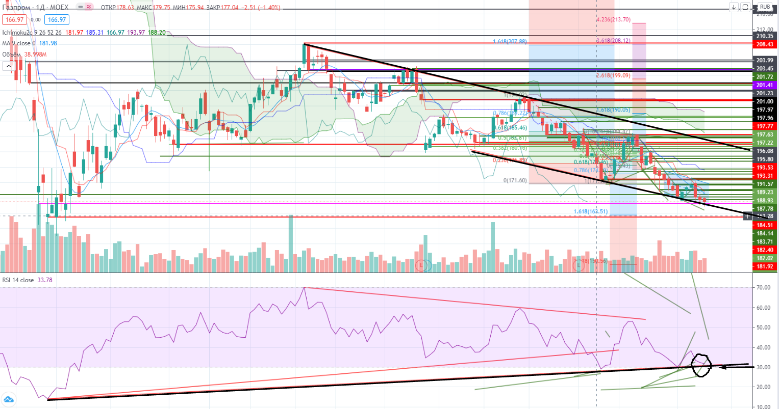 Газпром на дневных графиках «стелется» по нижней границы канала и RSI близок к тренду, а с учетом очень близкого нахождения к зоне перепроданности вероятность отскока несколько возрастает.