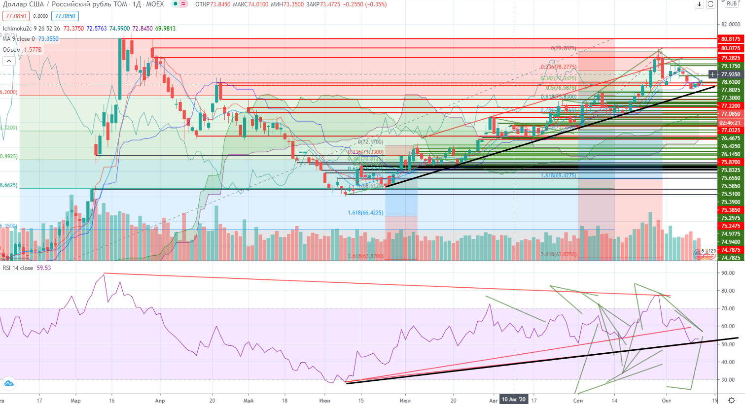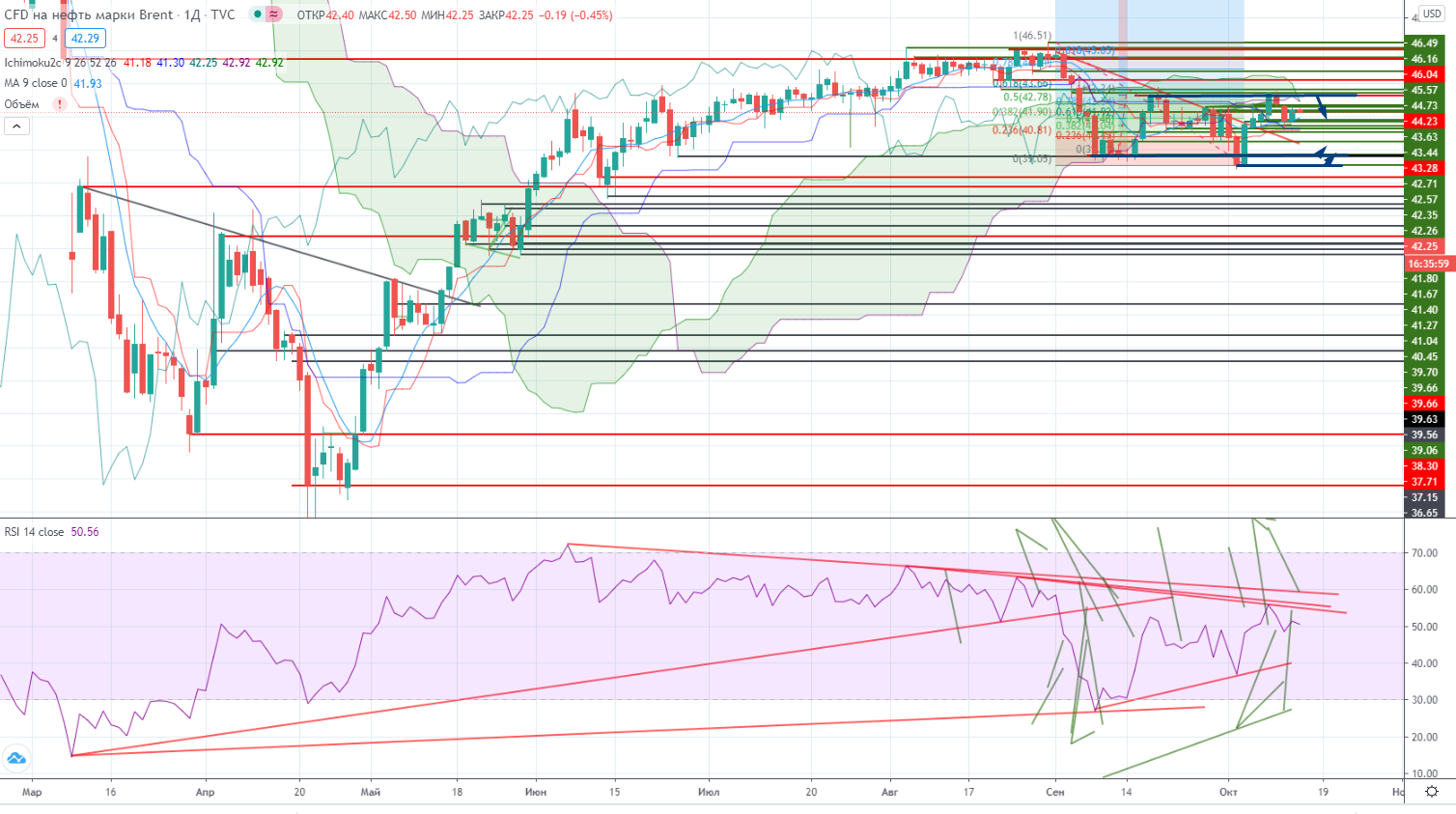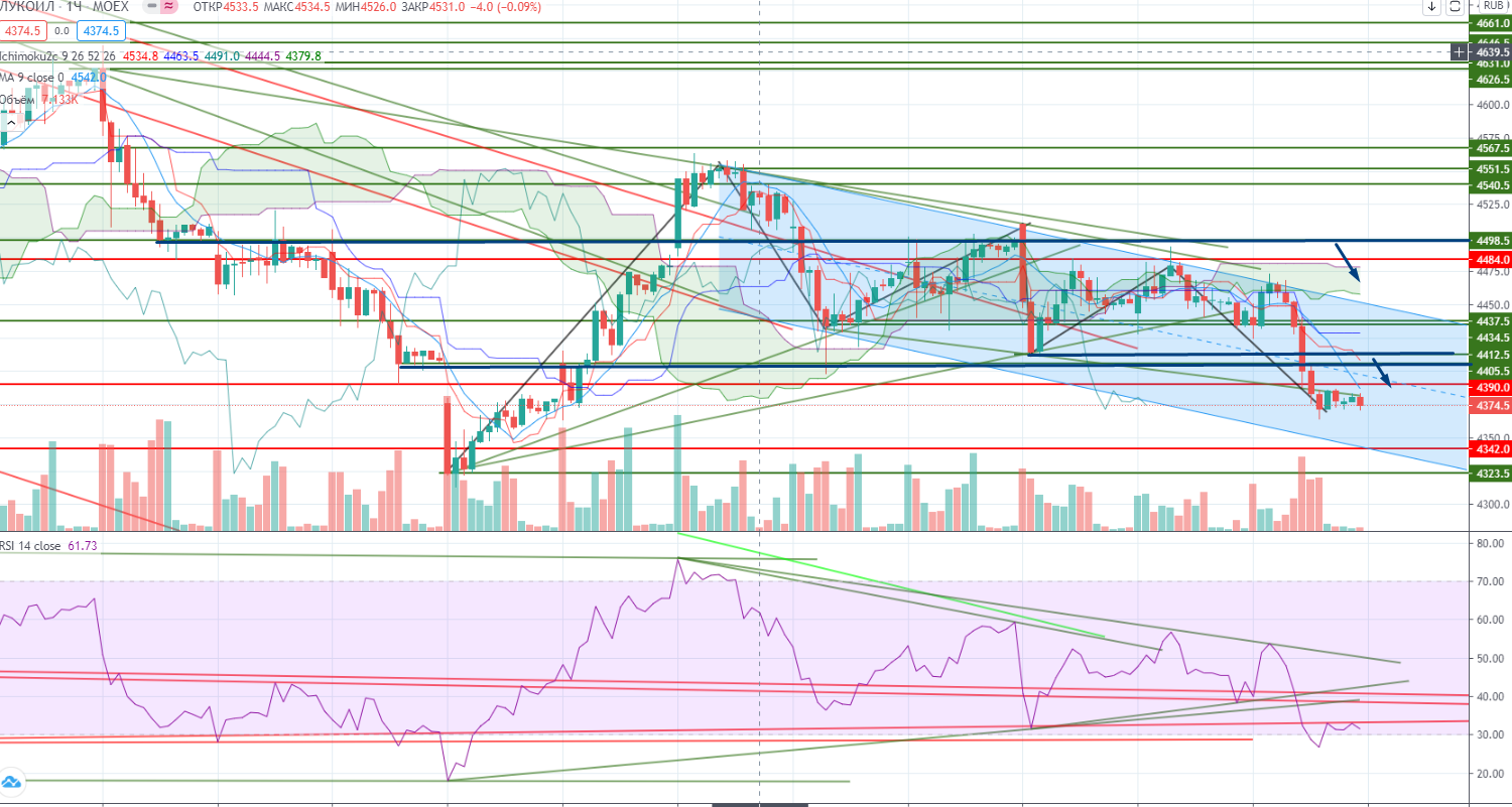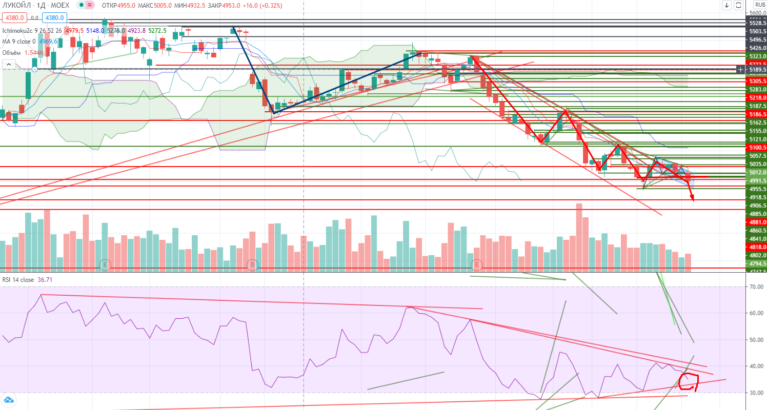 Но эту 3-ю волну можно разбить также на волны. Почти пробили реперный уровень 4379, и если сегодня Лукойл закрепиться ниже, то продолжения падения не миновать. Чуть «мешает» RSI, который уже близко к своему тренду, но на панике (которой я все же не увидел, но жду (https://www.finam.ru/analysis/marketnews/chto-budet-s-neftyu-esli-pandemiya-vse-taki-prodolzhit-svoe-nastuplenie-20201005-09550/)) это может случиться, ведь RSI только индикатор, главное цена.