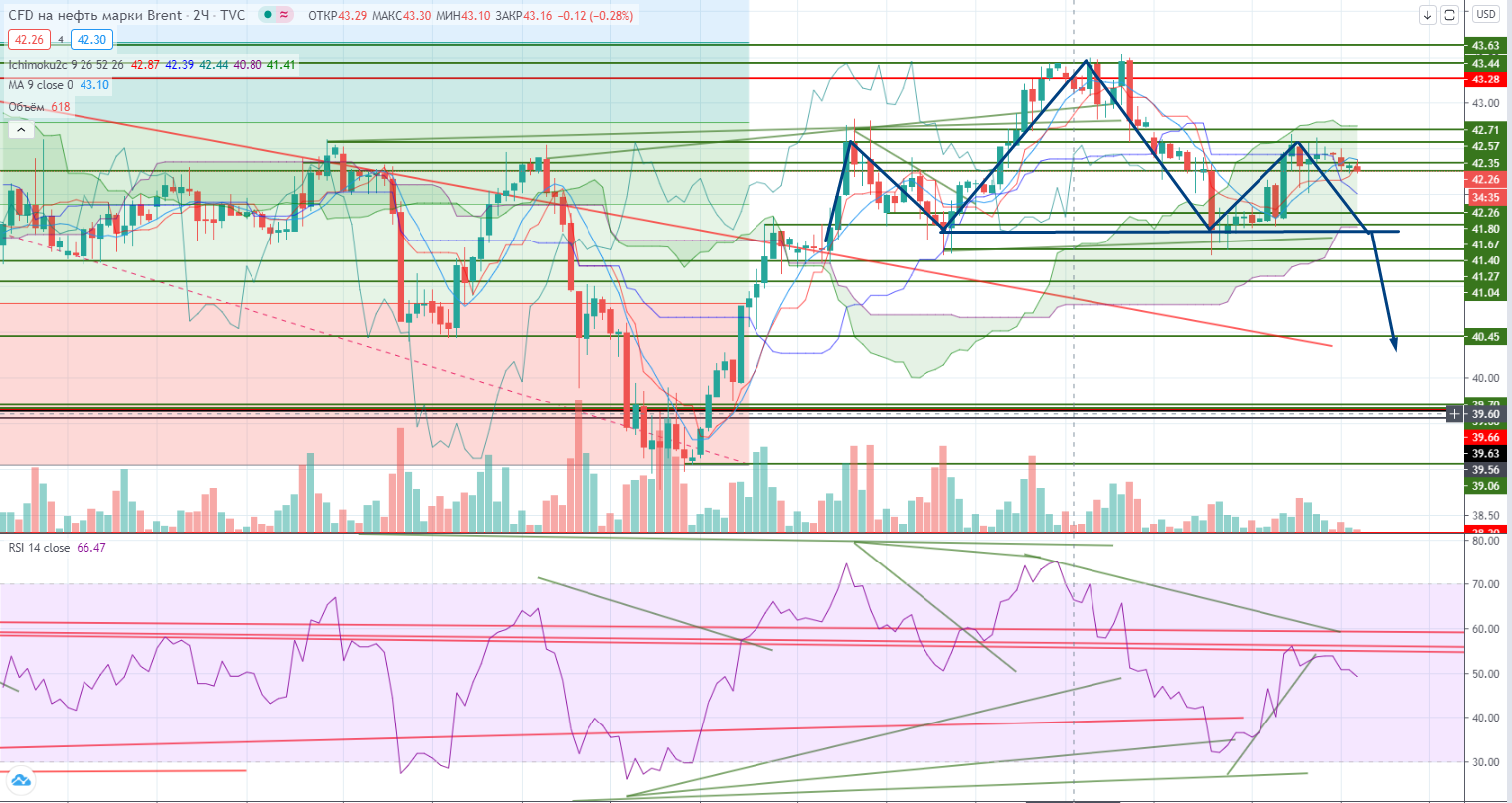 Более того, на 2-х часовом графике намечается пока формирование правого плеча возможной фигуры «Голова и Плечи», так что в случае пробоя линии шеи нефть может уйти еще ниже.