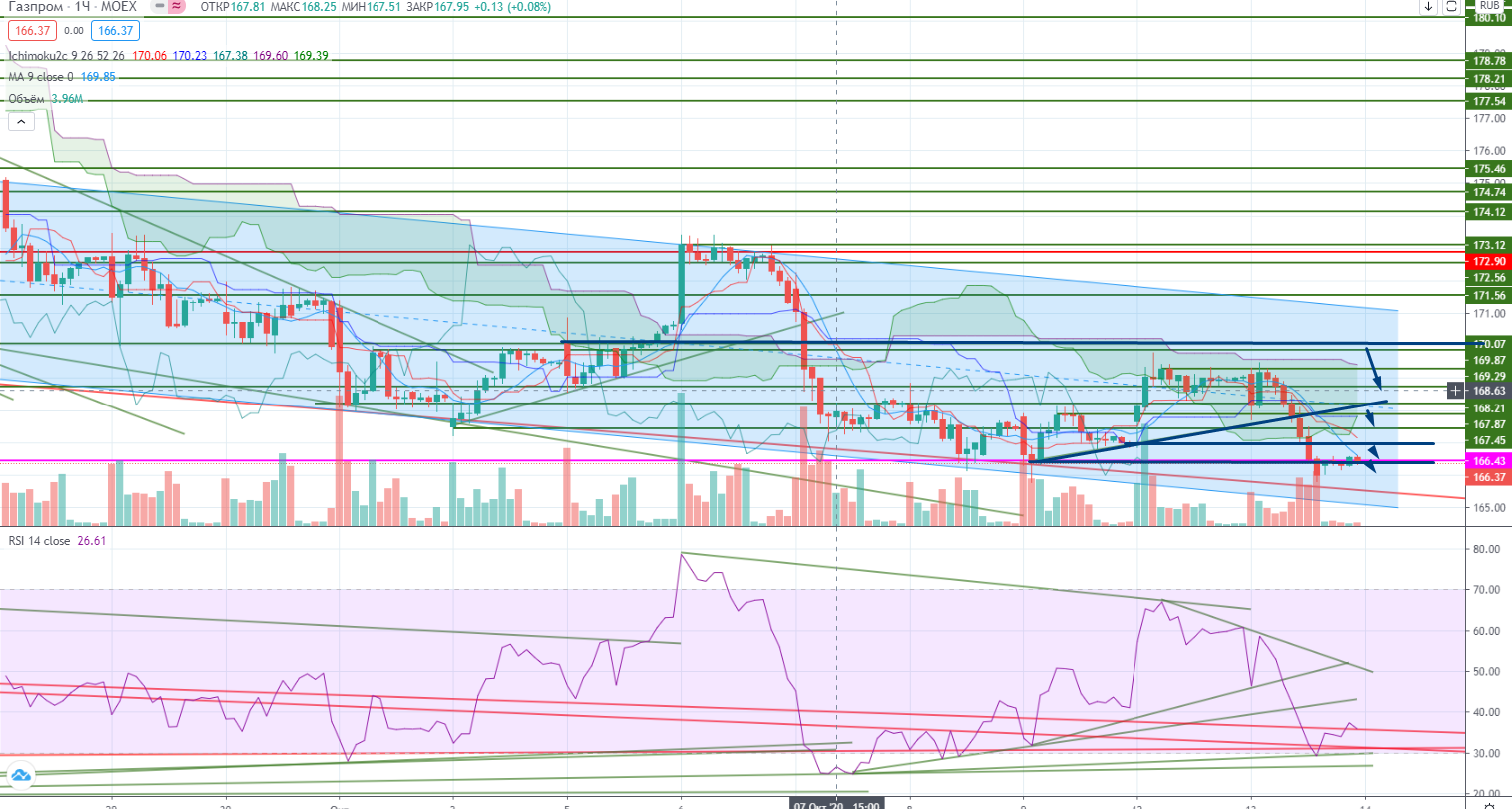 В Газпроме на дневных графиках неоднозначная картина, но пробита поддержка 166,97, которая будет теперь сопротивлением. Опять же Газпром ползет вниз по нижней границе канала, что конечно «мешает» падению. И RSI тоже недалеко от своего дивергентного тренда.