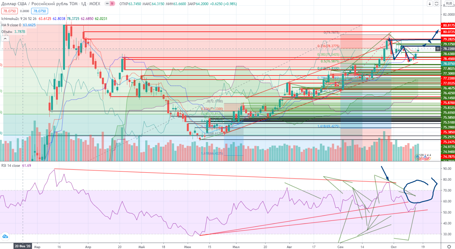 В паре доллар/рубль все пока идет в моем понимании, но рост доллара может быть ограничен уровнем 78,47. После пробоя оного (если конечно он будет) он попадет в зону неоднозачности по RSI (будет «дырка»), но на панике (если она все же будет) могут вынести и выше 80+.