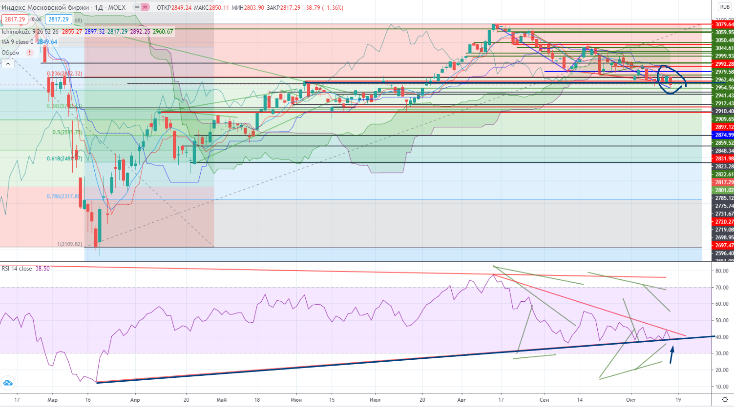 Индекс ММВБ формально пробил уровень поддержки 2831, но RSIеще пока не пробил свой дивергентный тренд благодаря начавшей отрастать нефти. Так что для быков еще не все потеряно пока. Может произойти «чудо», хотя откуда оно может прийти мне пока не понятно. Возможно из за нефти в случае выхода ее из боковика вверх.