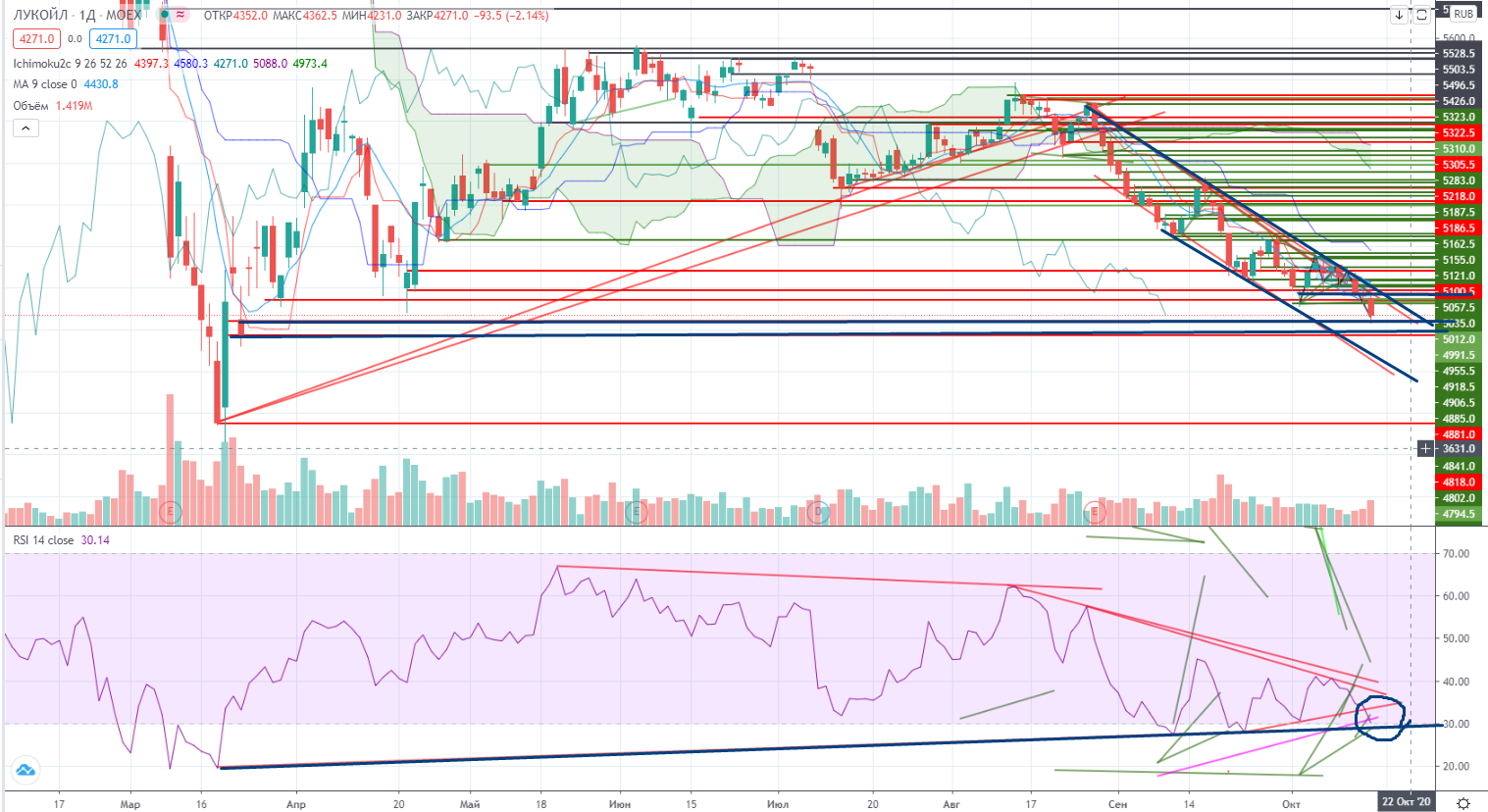 Я был окрылен вчерашней ночной идеей в Сберах (https://www.finam.ru/analysis/marketnews/otskok-v-akciyax-lukoiyla-ochen-vozmozhen-20201015-09550/) , но она сразу же дала трещину. Но хорошо хоть без сделок. Я стараюсь найти уровни пока мысленно, но на практике они не выдерживают пока, так что даже виртуальная статистика пока отрицательная. Пока рано ими торговать, но на следующей неделе придется все таки начинать что-то делать в нем.