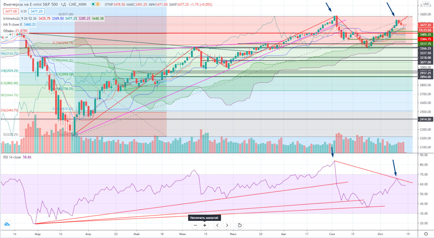 В США накануне выборов пока не могут договориться по поводу новых стимулов, происходит непонятное, а рынок «не любит» неопределенностей. Вот фьючерс на S&Pи падает. Но до выборов еще есть время для выхода на новый исторический хай...