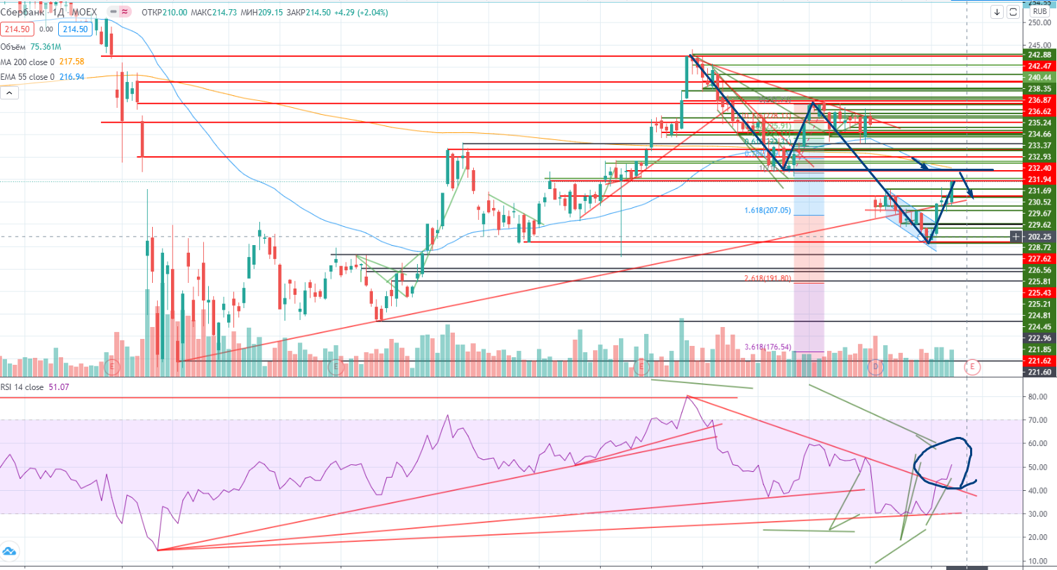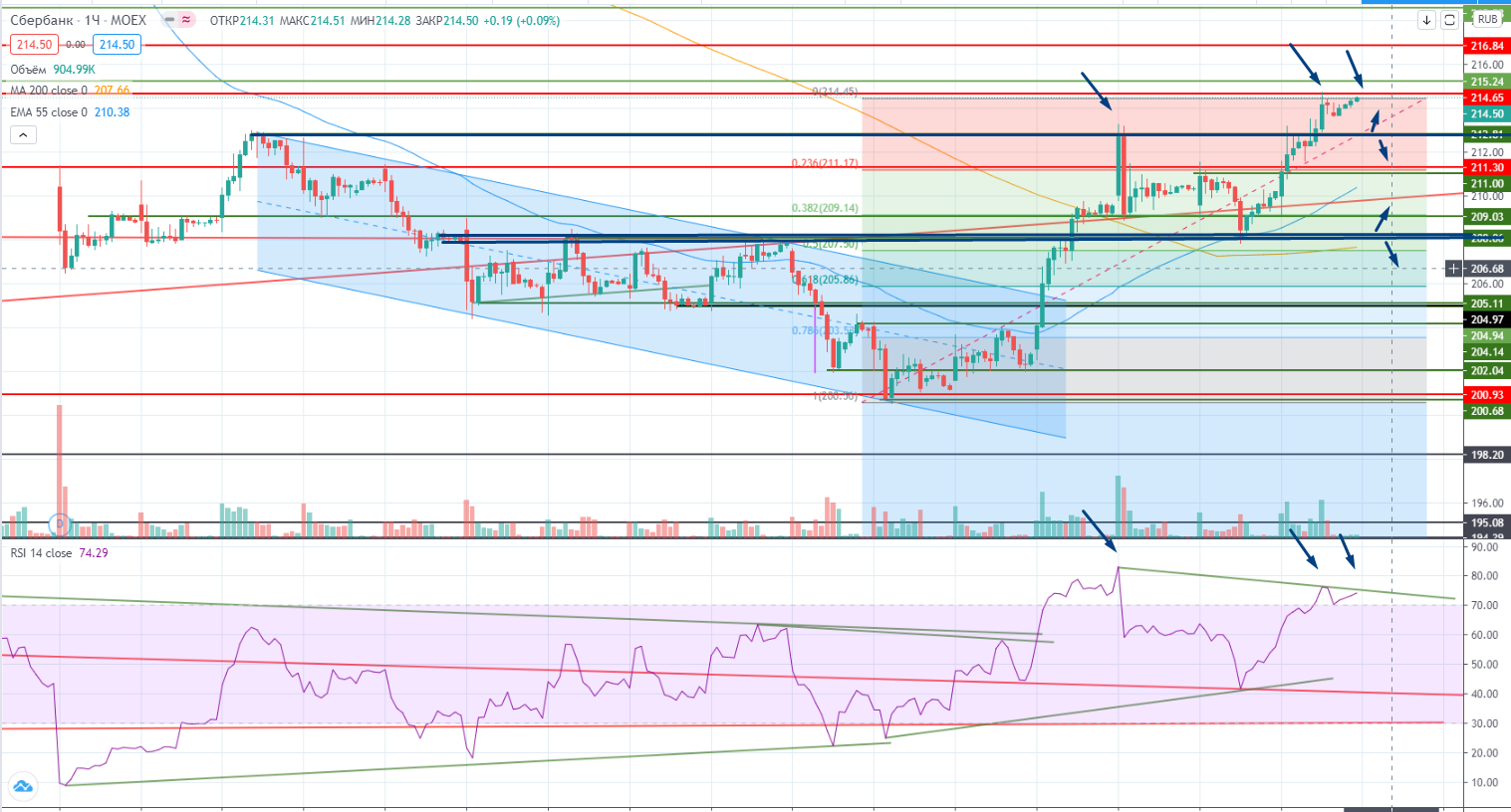 В Сбербанке на днях рисуется рост, и пока в нем нужно торговать от лонга. Но и тут рост не вечен, поэтому я лично дуду искать на часах лучшую цену для входа в шорт в районе 217-218 (предыдущее лоу + 55EMA на днях).