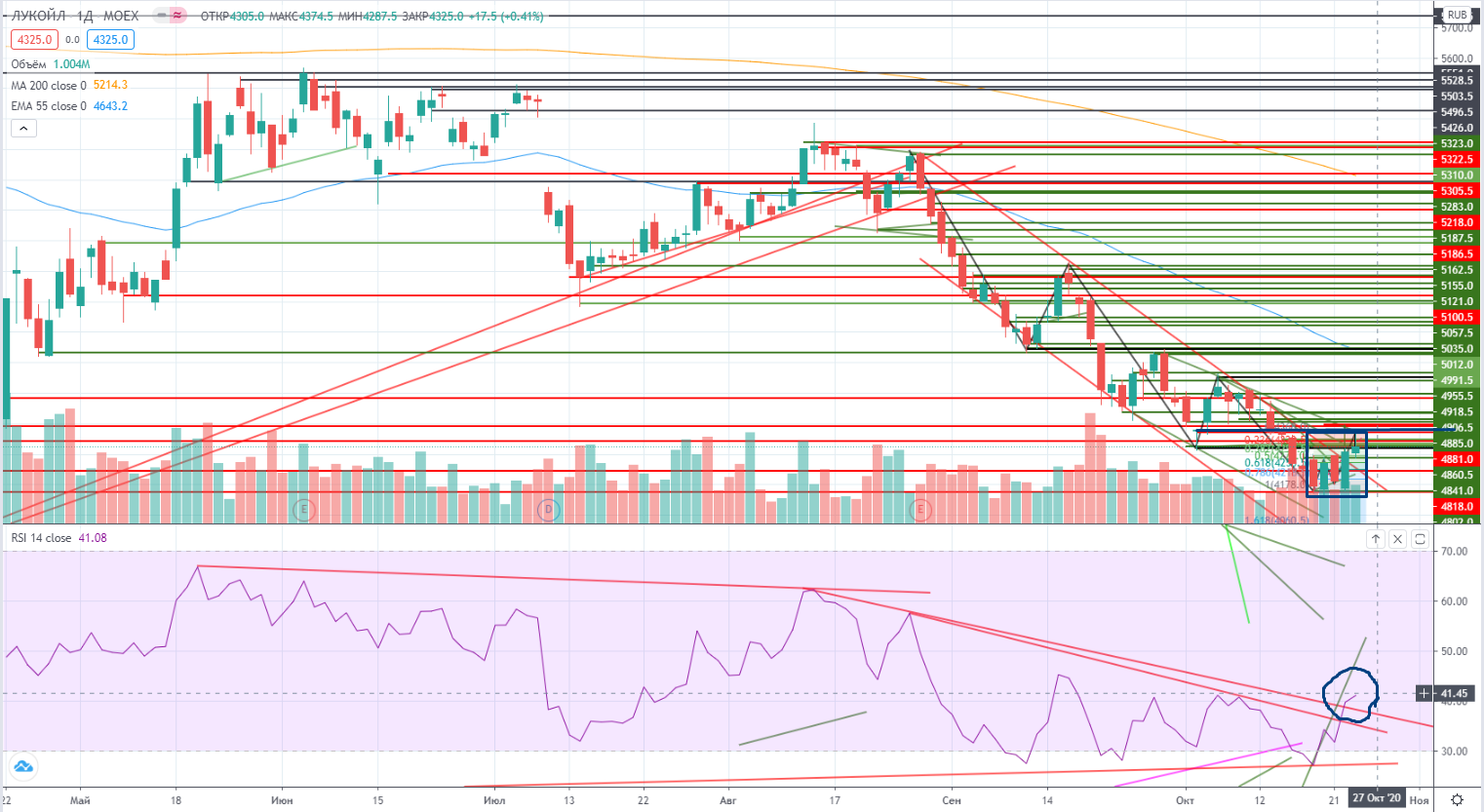 Лукойл на дневных графиках рисовал подтверждение разворотной формации, но по закрытию это подтверждение выглядит неубедительно, хотелось бы большего, ближайшее сопротивление в случае прохода 4379-, но пока не совсем однозначный разворот…RSI тоже косвенно подтверждает разворот, но еще раз повторюсь, это только косвенная вещь.