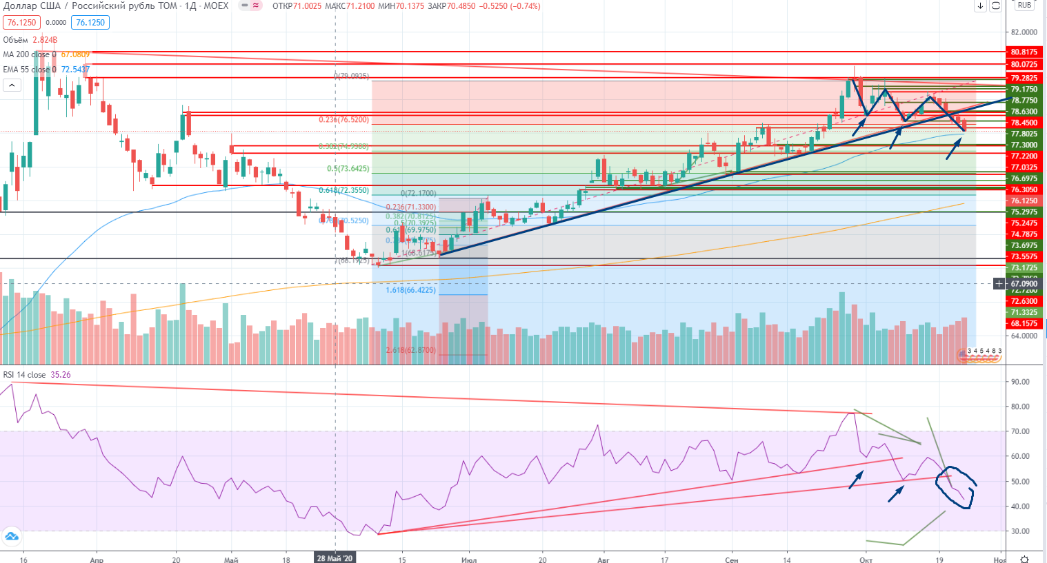 В долларе все опять не логично, вместо падения (из-за нефти) он укрепляется. Пробит тренд и каждое новое лоу сопровождается новым лоу по RSI, так что противоречий укреплению нет, о таком возможном развитии событий я в принципе предупреждал.