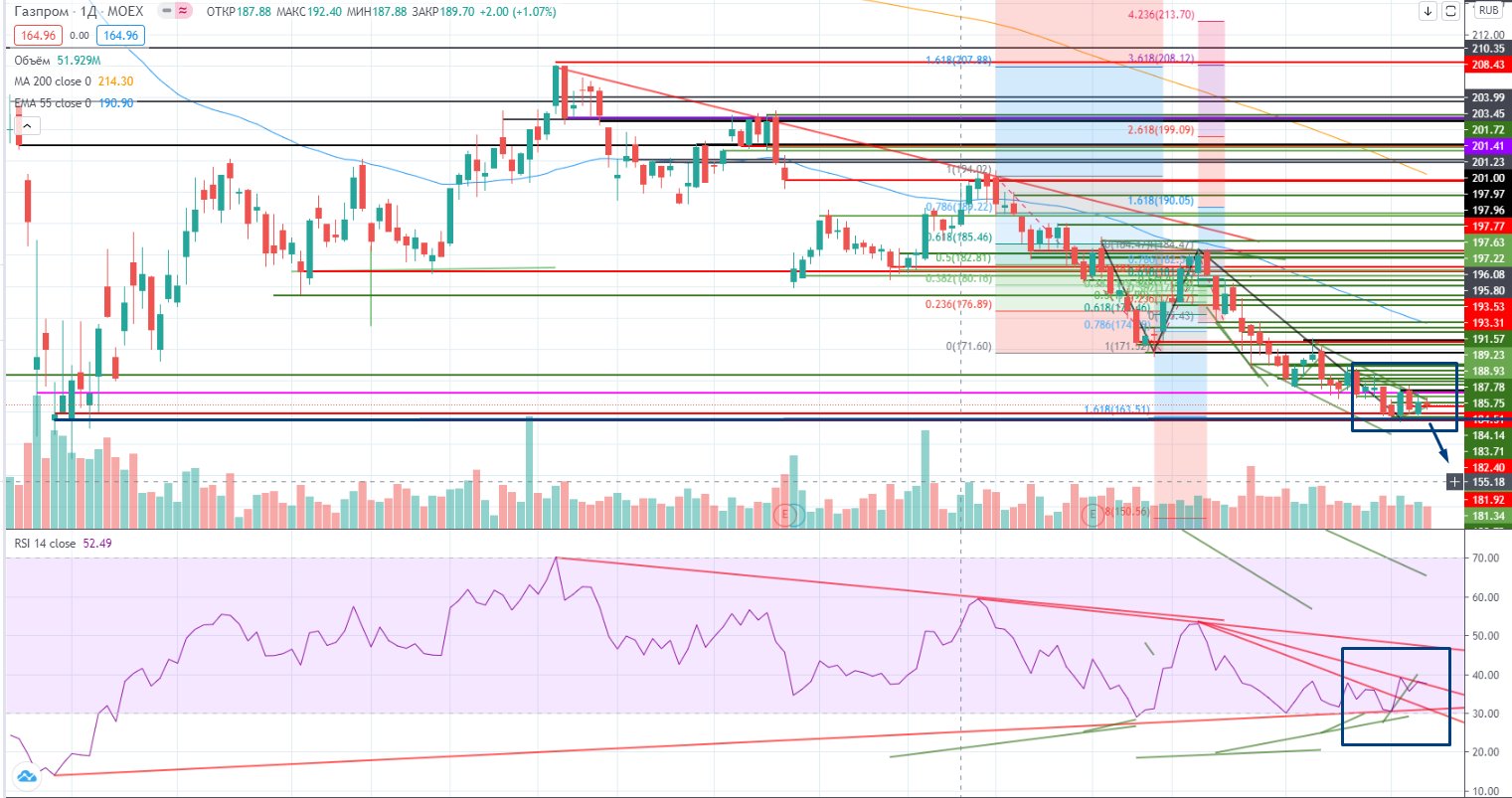 Газпром на всем этом продолжает выглядеть очень слабо, так что пока ни о каком лонге речи не идет. Но при закрытии ниже 163 нужно вставать в шорт.